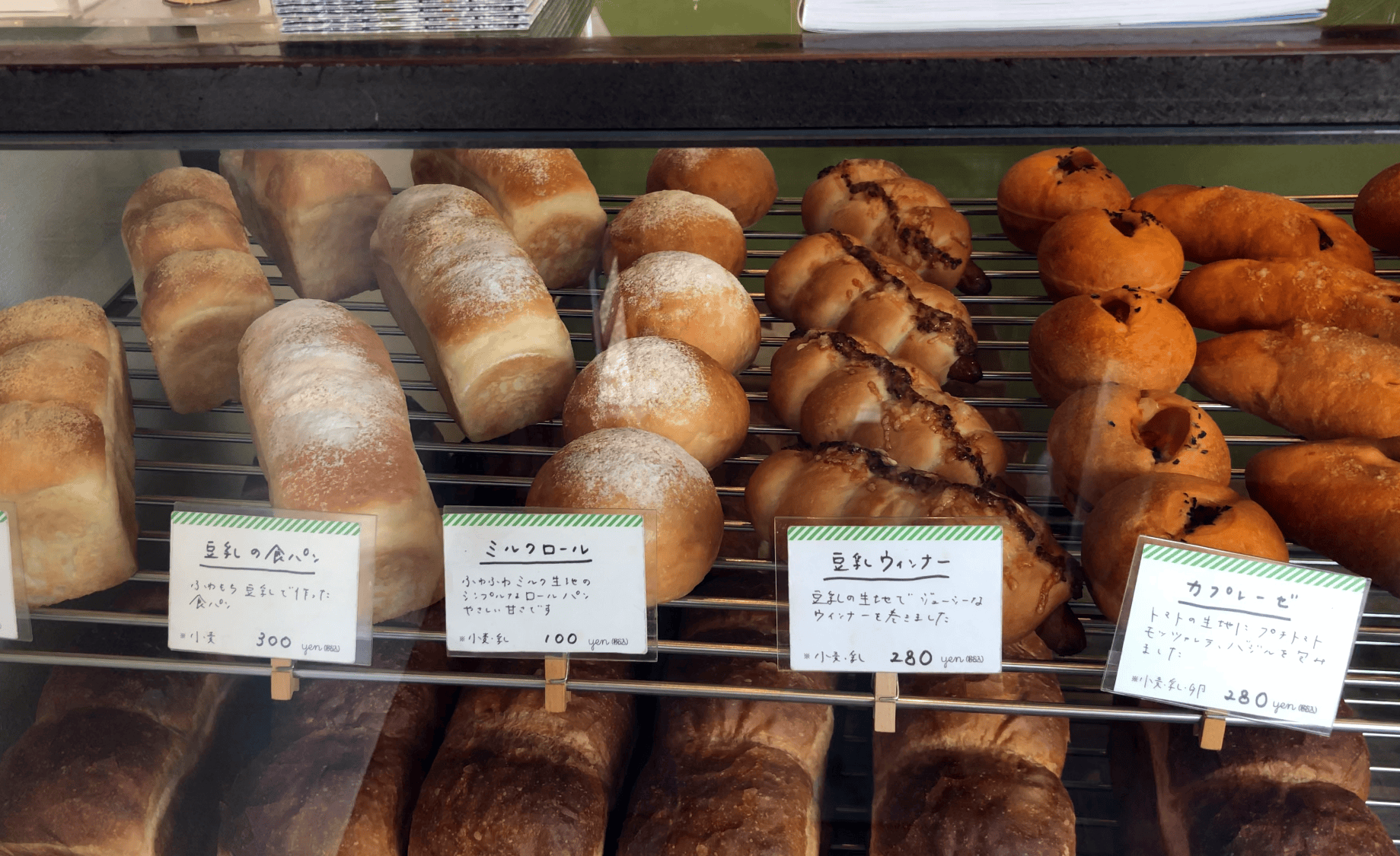 厳選した素材で毎日手づくりする、味わい深いパンが買えます。柔らかそうな豆乳の食パンや、プチトマトやモッツァレラチーズが入ったハードパンも魅力的。私は人気の食パンを一斤買って、厚めに切ってもらいました。