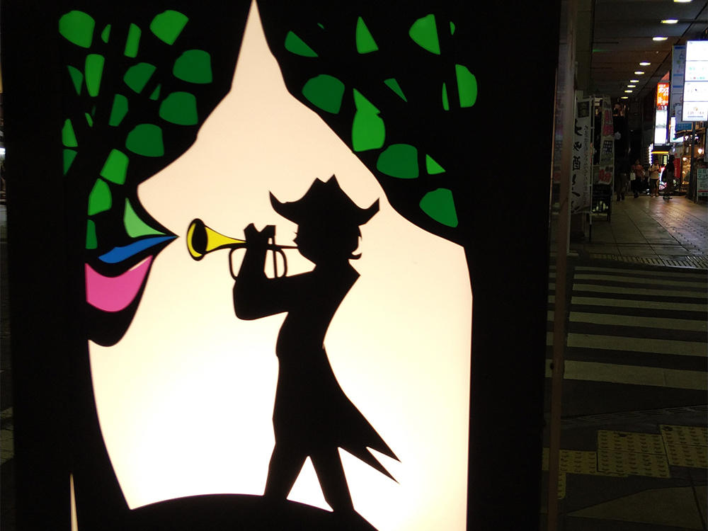その商店街の14本の柱にとても素敵な影絵のフラッグを発見!そのファンタジーなフラッグは柱の下の光の照射から柱ごと明るくする演出をしてくれて、「光彩の柱」として評判を呼んでいるそうです。