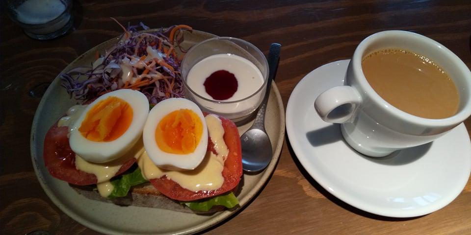 ワンプレート(卵とフレッシュな野菜のオープンサンド&サラダ&ヨーグルト)と珈琲のセットは1日の朝の始まりにぴったり!