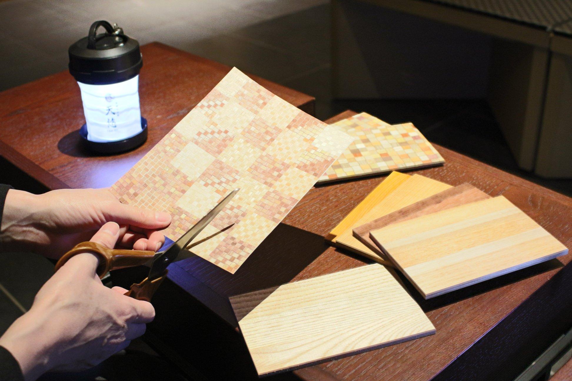 天悠5階「ライブラリーラウンジ」では、毎日、伝統的工芸品の箱根寄木細工を使った“寄木はがきづくり”が体験できます。