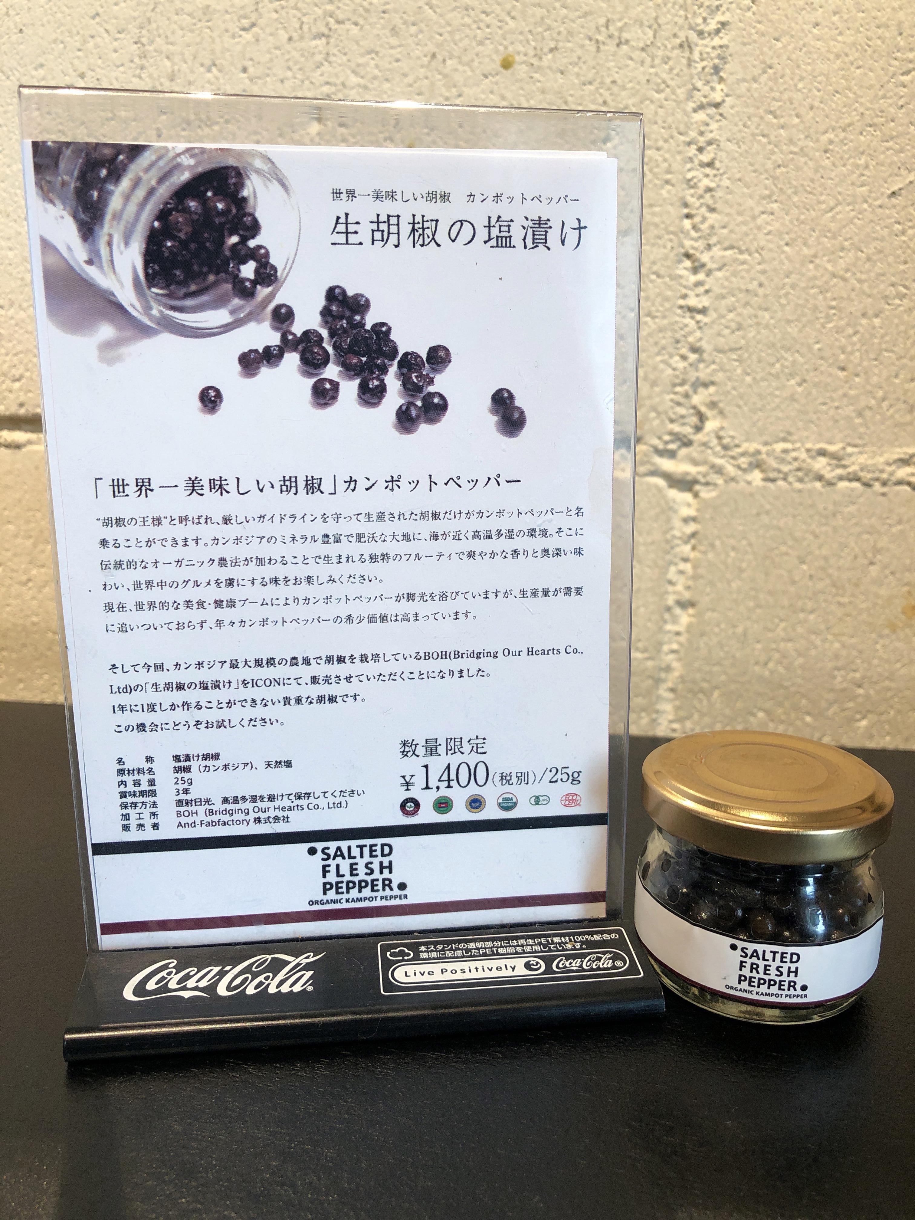 摘みたての最高級カンボジア産胡椒を特別な製法で天然塩に漬けにしてあります。生胡椒の食感を残したまま塩漬けになっているのものはここでしか買えないとのこと。
