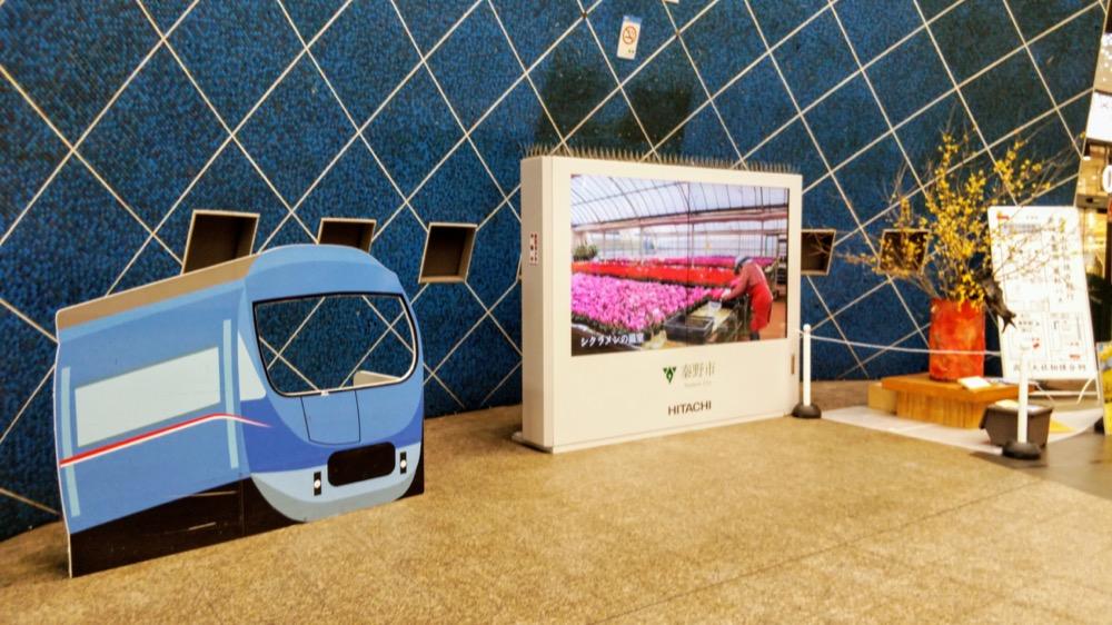 改札口正面で出迎えてくれる秦野らしいディスプレイとロマンスカーのパネル