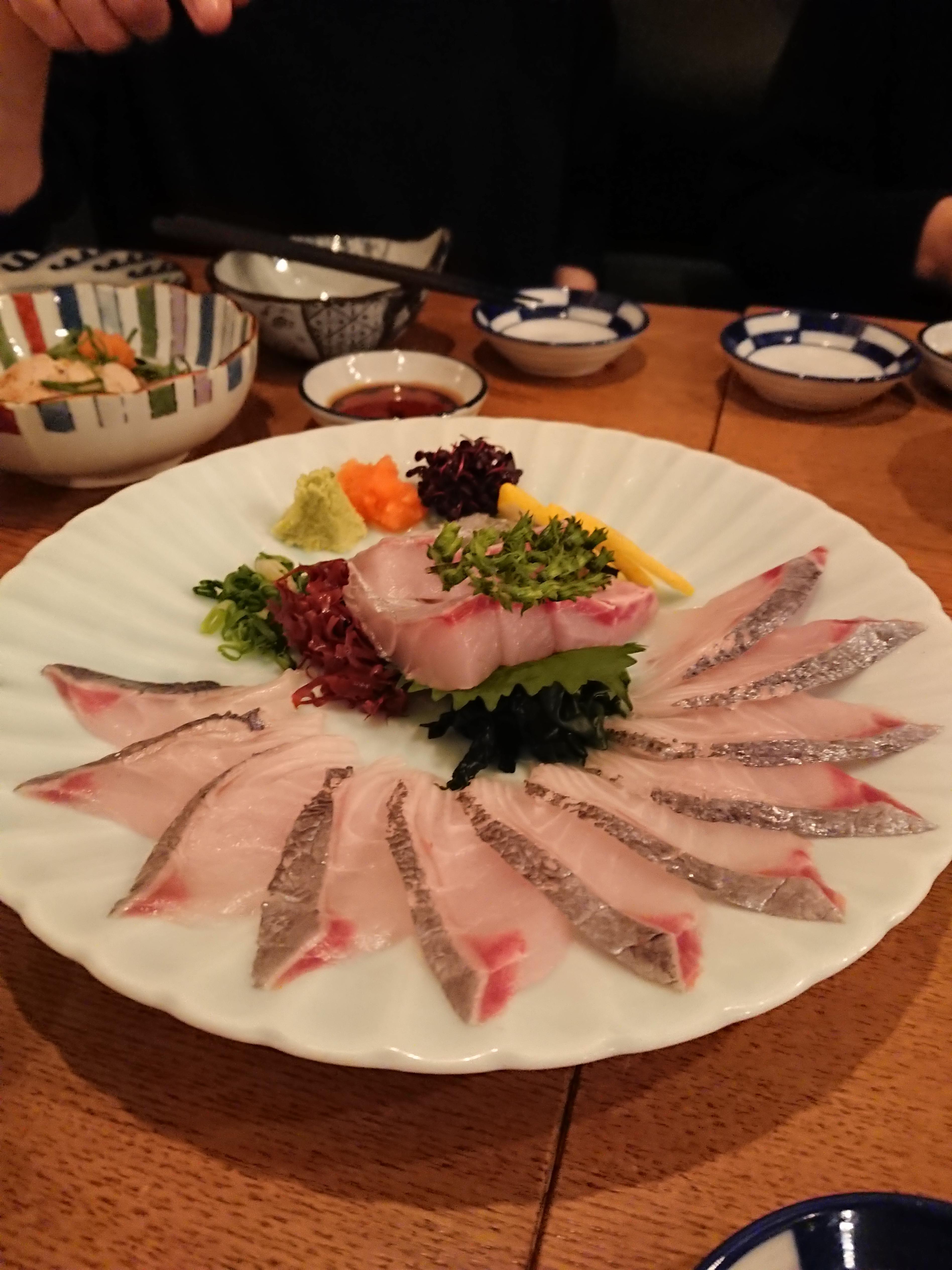 席に着くなり、おかもち一杯の魚がどーんと運ばれてきたので、魚に詳しくない私はドギマギ。