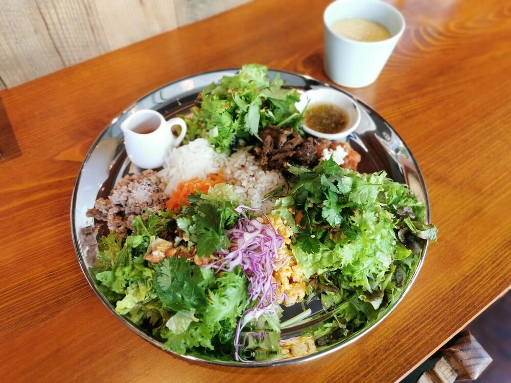 インスタ映えのするカラフルなプレートには、パクチーやわさび菜、紫キャベツ、大根や人参のなますなどの野菜の他に、炒り卵、ひき肉、ローストチキン、ラタトゥイユ、ナッツ、そしてご飯の組み合わせ。