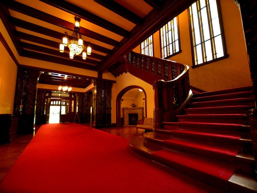チューダー様式を取り入れた外観、真っ赤な絨毯が敷かれた階段広間。