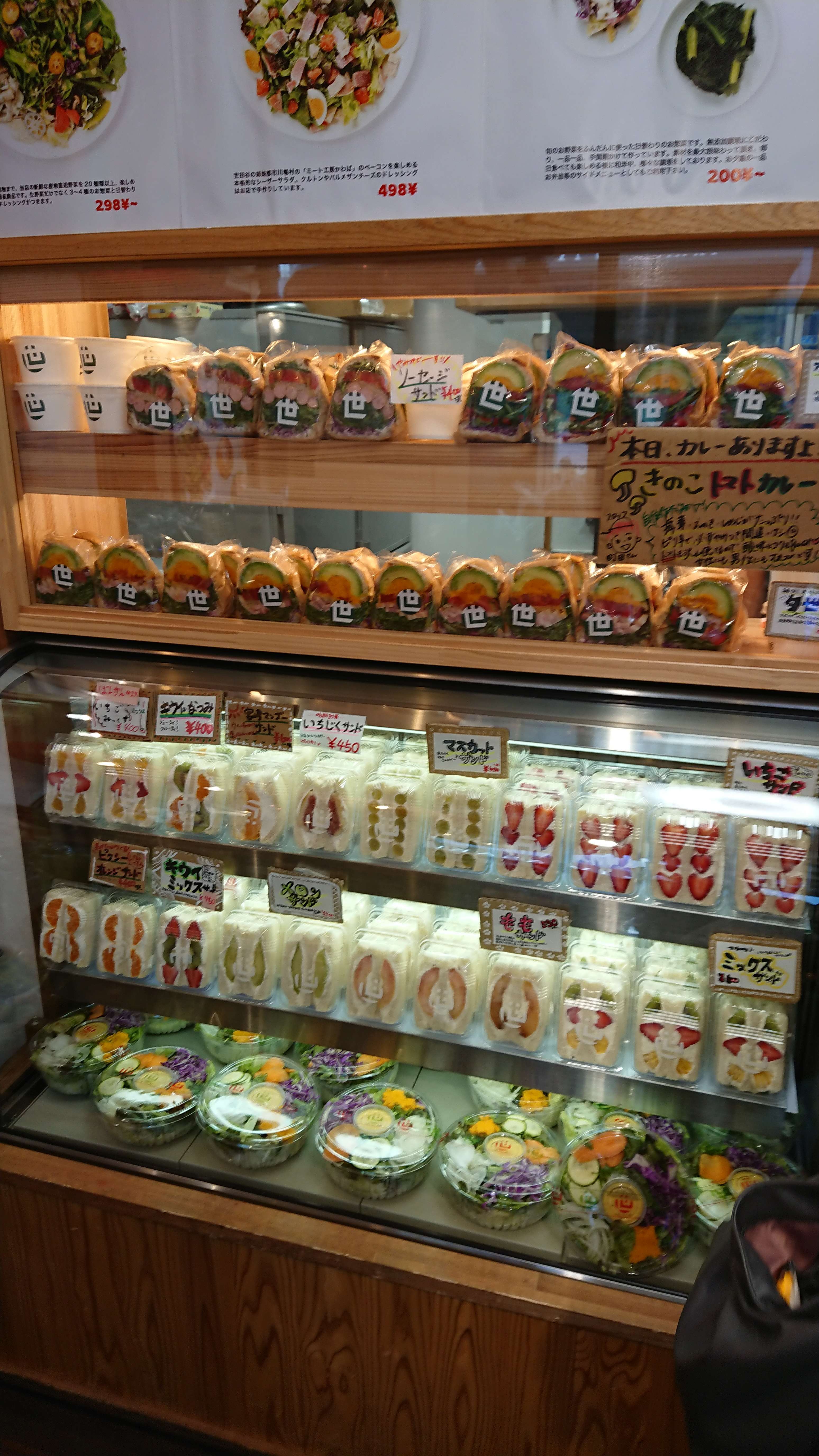 色とりどりの綺麗な野菜や果物たちに引き寄せられるように店内に入ると、ショーケースの中にはおいしそうなサンドイッチやサラダがお出迎え。