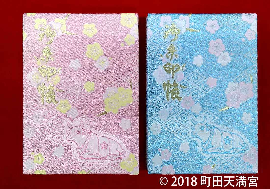 桃色と水色の2パターンが用意されていて、表紙には町田天満宮ゆかりの「撫牛」と梅の花がデザインされています。