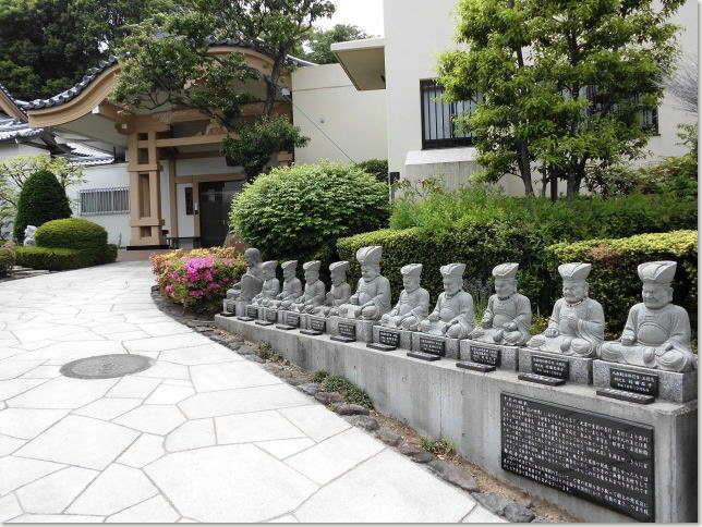 ほうきを持ってほがらかな笑顔をしている掃除小僧の隣には、険しい顔をして並んでいる十体の石像たちが見えます。