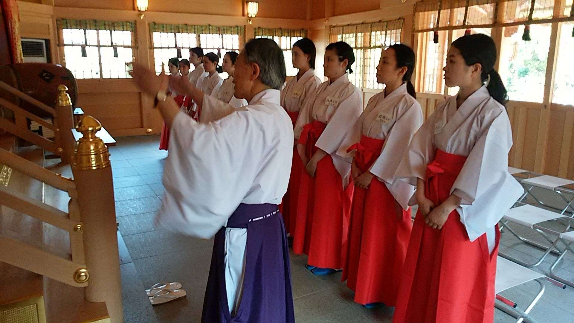 緋袴(ひばかま)と白足袋の巫女衣装に身を包み、宮司や禰宜から巫女の立ち歩き方・手水の作法・参拝の作法を教わります。