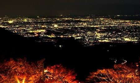 夜空の下で明るく照らされた紅葉と遠くの街灯り、そして暗い海のコントラストは世界的にも高い評価を受ける絶景です。