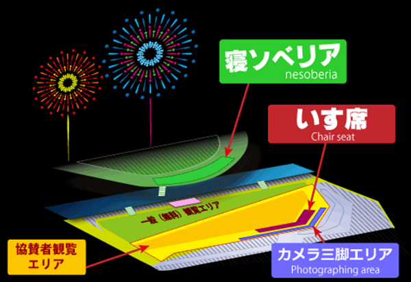 1口5,000円の協賛金を納めれば協賛エリアチケット2枚をもらえるほか、大迫力の花火を間近で寝そべりながら楽しめる「寝ソベリア」(指定)、イスに座ってゆったり観覧できる「いす席」(指定)、三脚を使った本格花火撮影ができる「カメラ三脚エリア」(指定)といったチケットもありますよ。