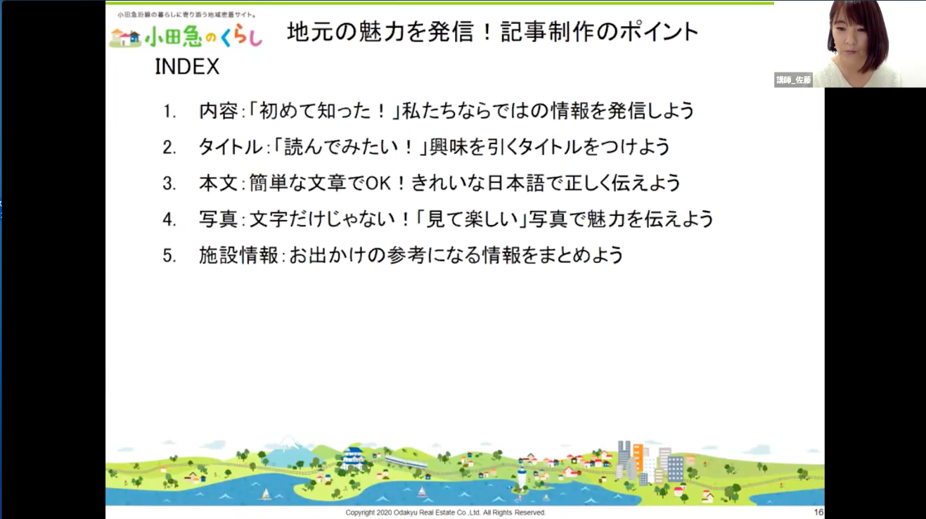 まずは“自分が読みたいと思う記事”をイメージしながら、小田急線沿線のアナタの街の魅力を、楽しく文字と写真で伝えてみてくださいね。