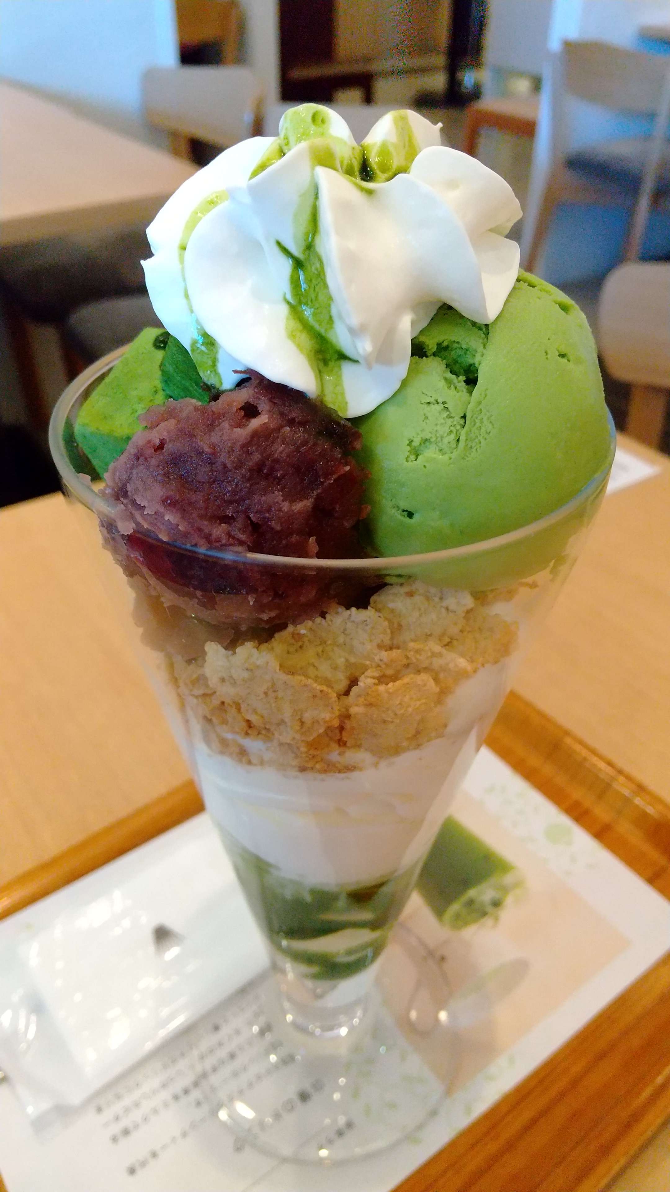 生クリーム、抹茶チョコ、あんこ、抹茶アイス、玄米フレーク、ソフトクリーム、抹茶ゼリーが入ってボリューム満点。
