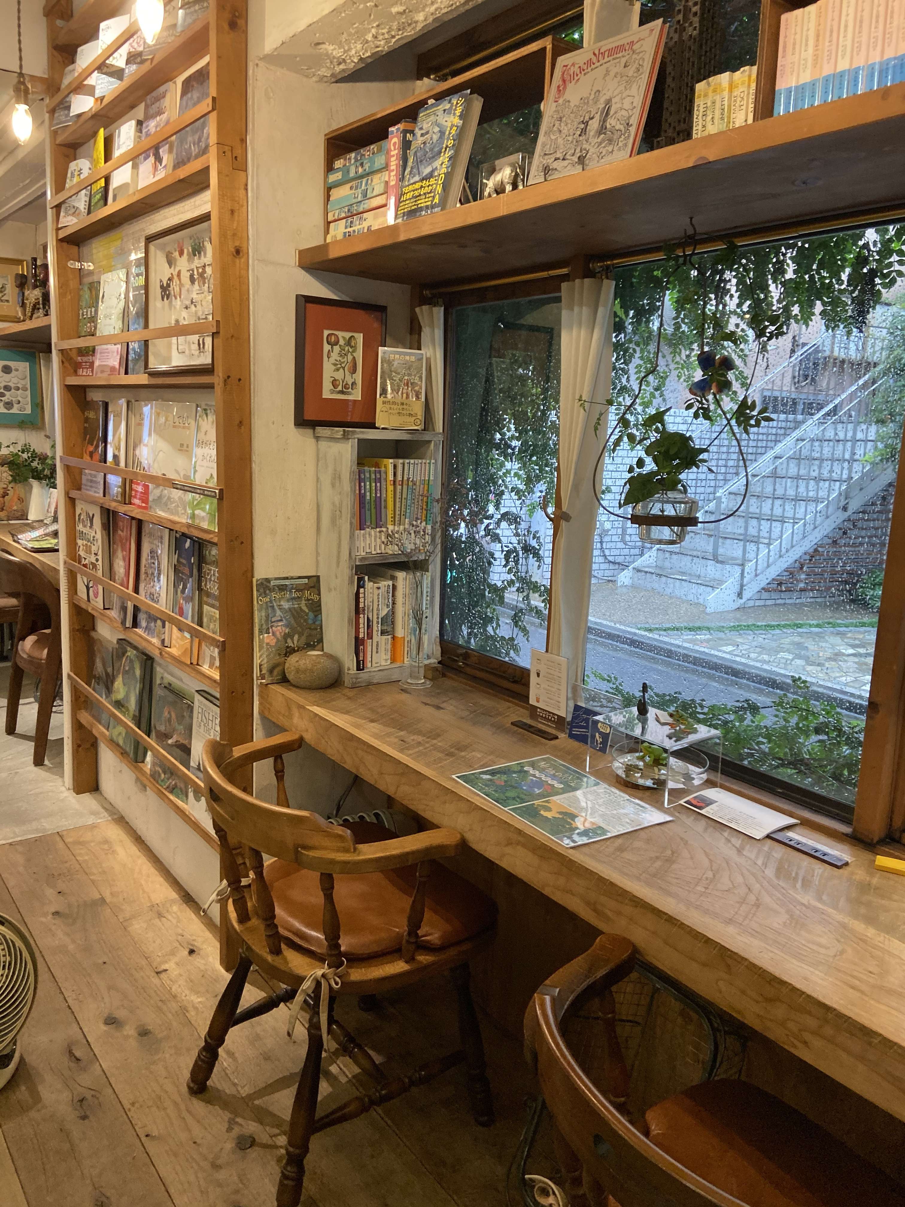 入り口のグリーンが不思議の国のような雰囲気の本屋さん&カフェです。