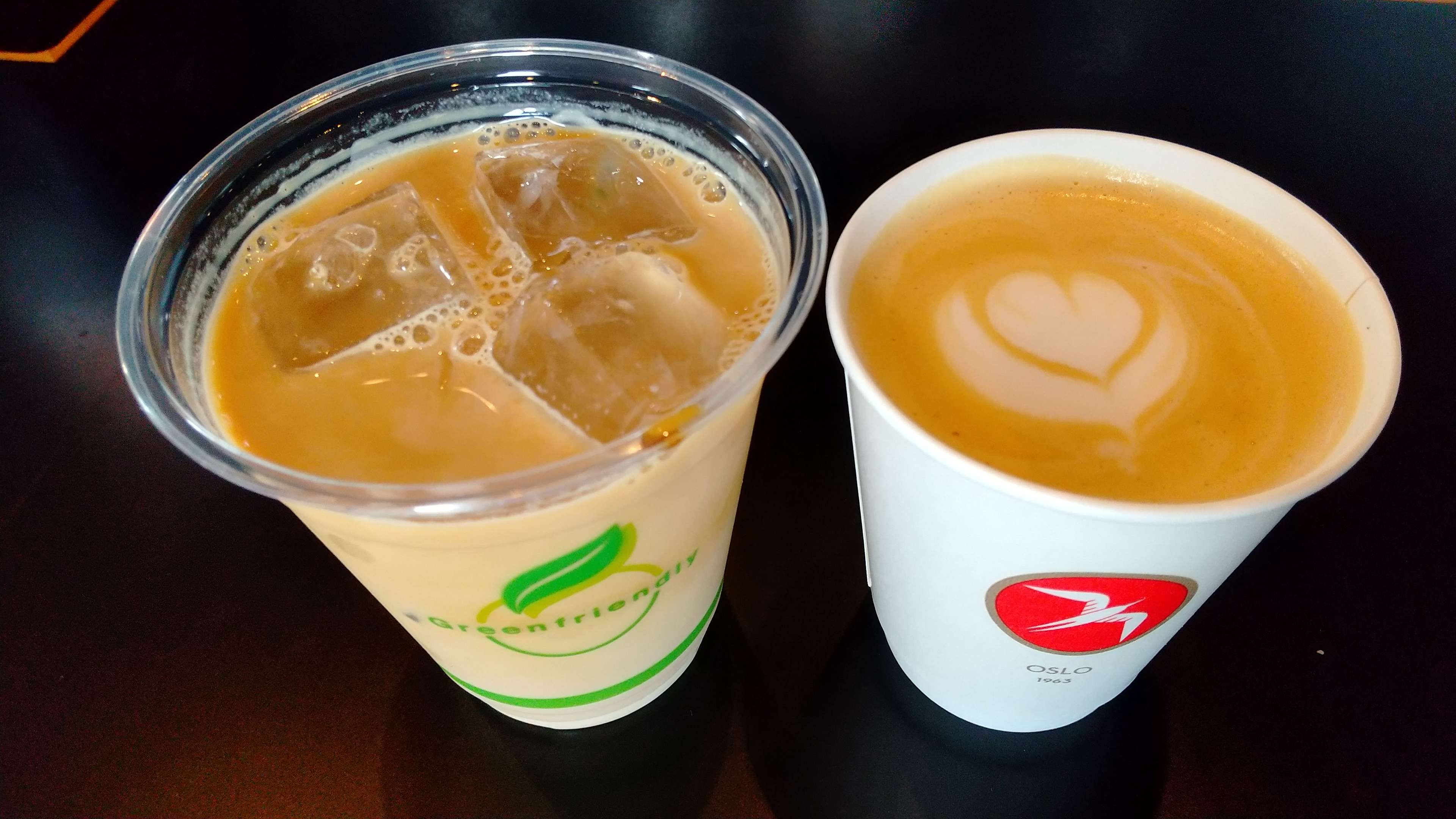 同じ建物の4階にあるオープンテラスでテイクアウトしたアイスカフェラテとカプチーノを堪能しました。