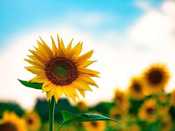 このように撮影すると、一つのひまわりが引き立たせながら、ほかにも沢山のひまわりが咲く広大さを伝えられます。