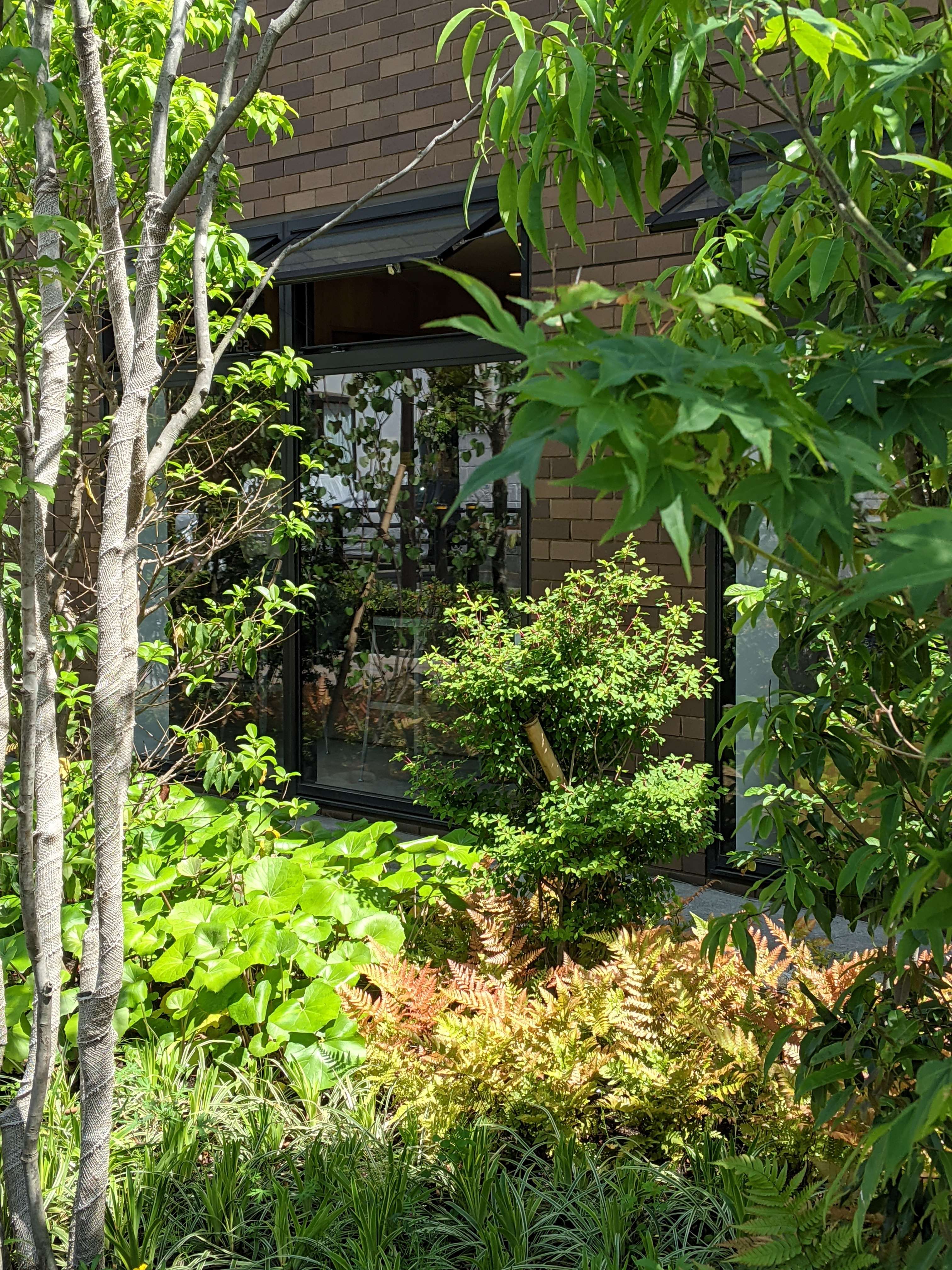 ハイチェアカウンターの一部の席からは外の草木の緑も見ることができます。