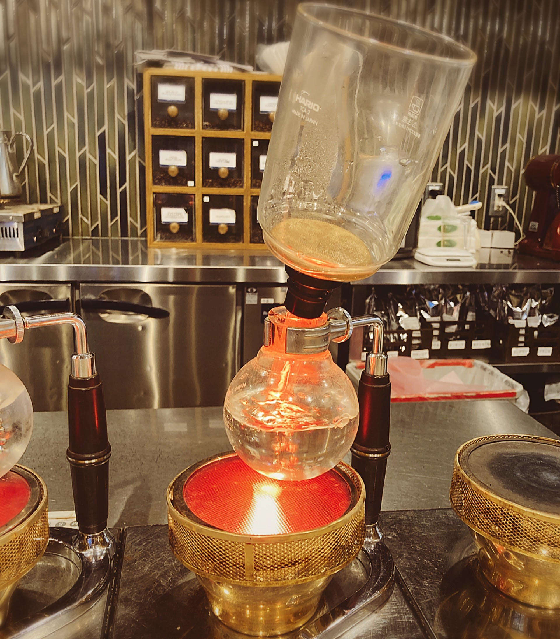サイフォンに入ったまま提供され、自分で気ままにカップにコーヒーを注ぎます。