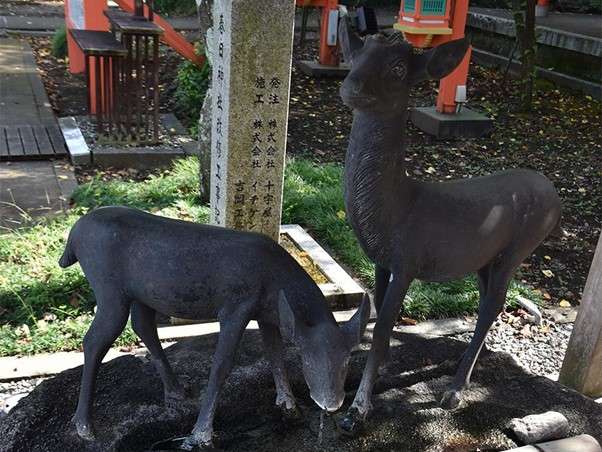 そのため、春日神社でも神鹿(しんろく)として鹿をお祀りしており、境内の手水舎も、つがいの鹿をモチーフにデザインされています。