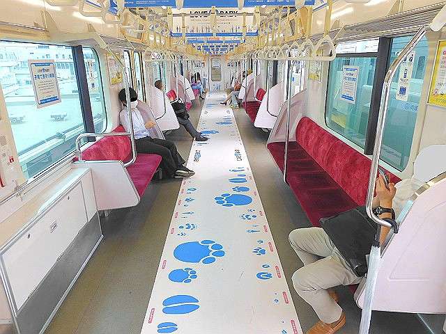 特定の1車両を「子育て見守り車両」として、「子育て中の方をあたたかく見守ってください」 というステッカーが貼ってあったり、車内床面を動物の親子の足型を象ったイラストシートを貼られ子供の心をつかむ工夫があったり、子育て層向けの情報等を謳った中吊りで埋め尽くされていました。