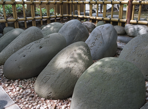 続いて、御本殿向かって右側には「力石」がずらりと並んでいます。
