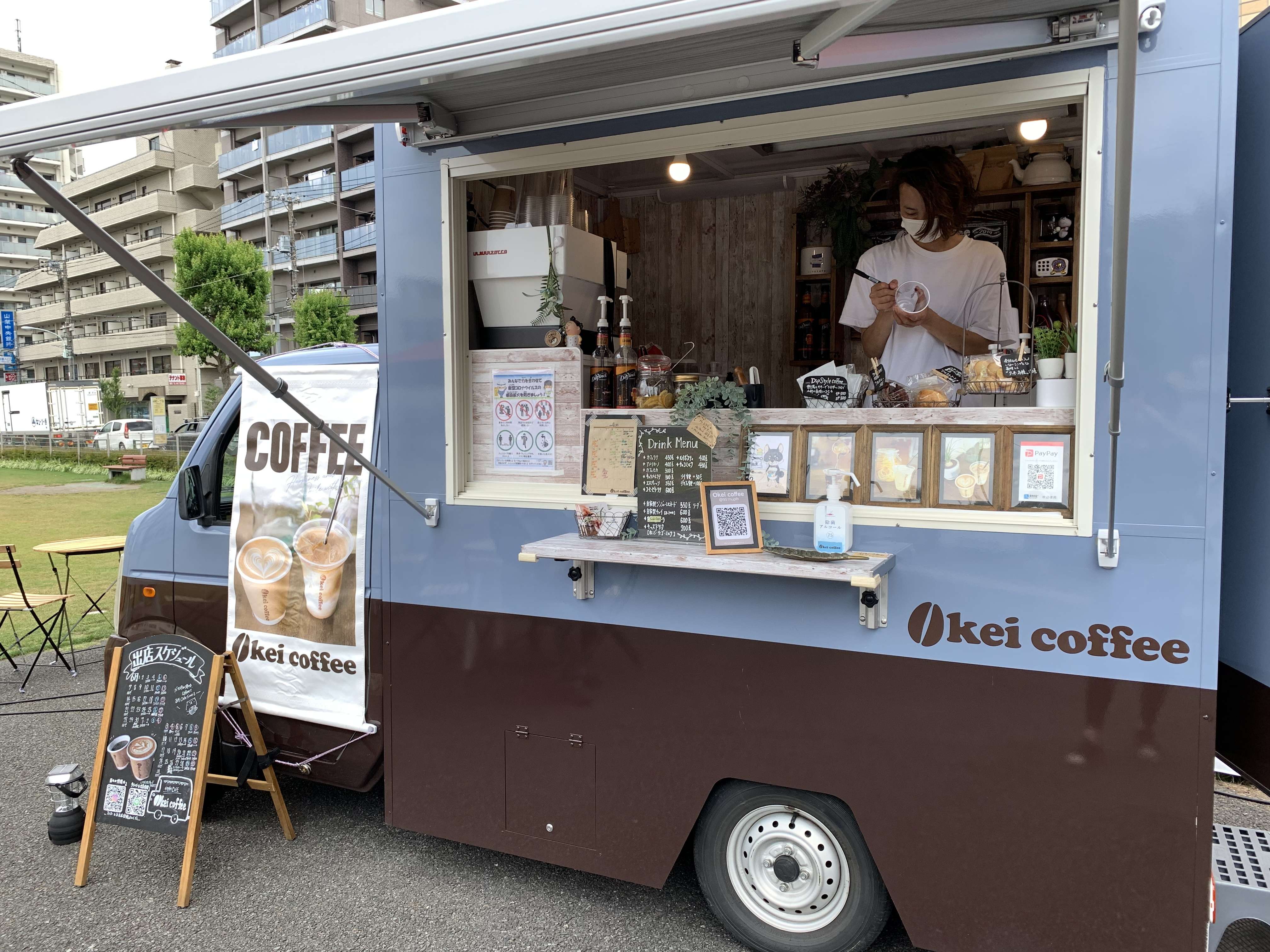 今日は移動コーヒーのお店、okei coffeeさんの煎りたてエスプレッソラテをいただきました。
