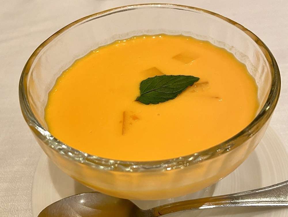 デザートのマンゴープリンは、ちょっとヒリヒリしている口の中を中和してくれる程よい甘味。