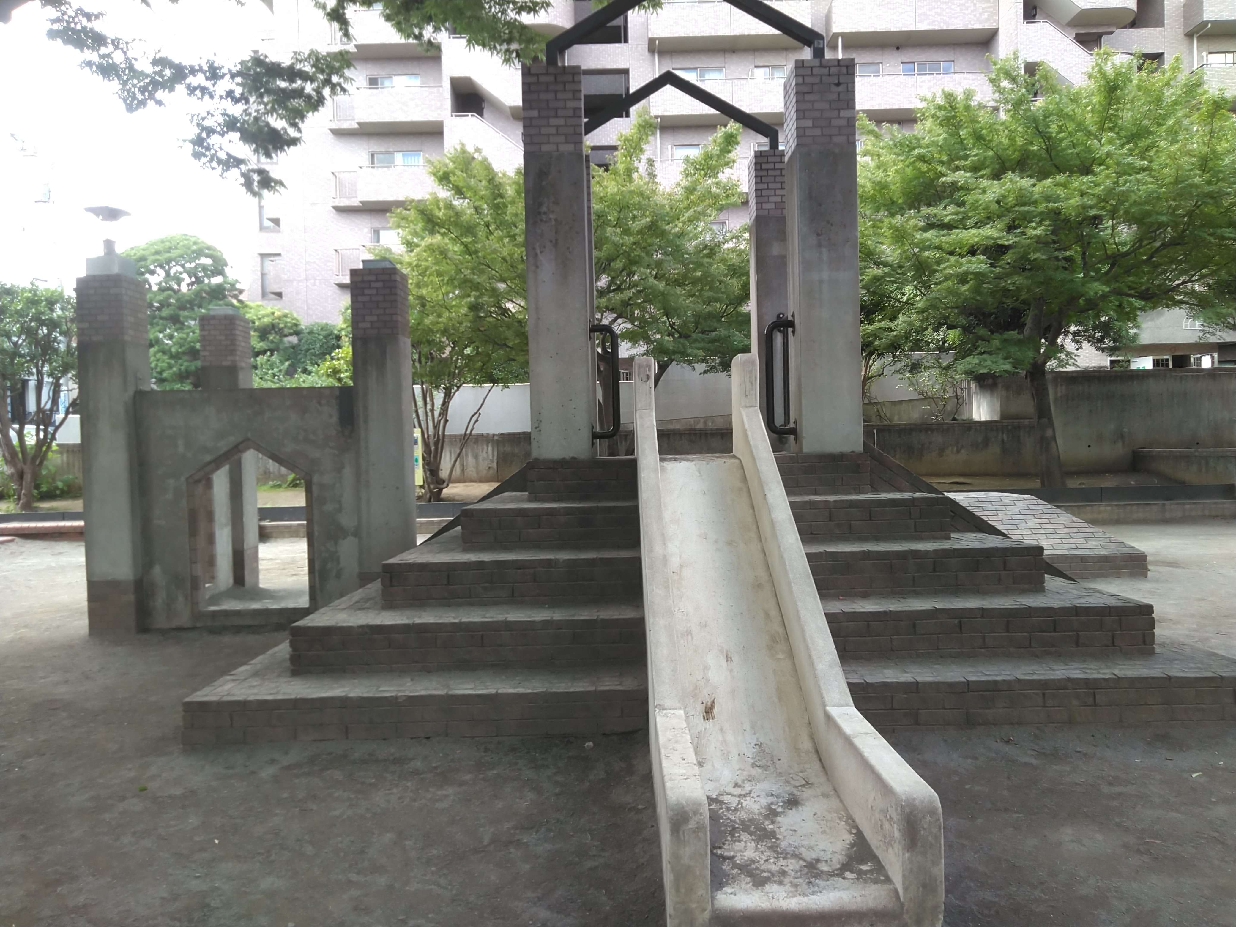 滑り台がついた、石(タイル)で出来た城のような塔が中央にあり、砂場があります。