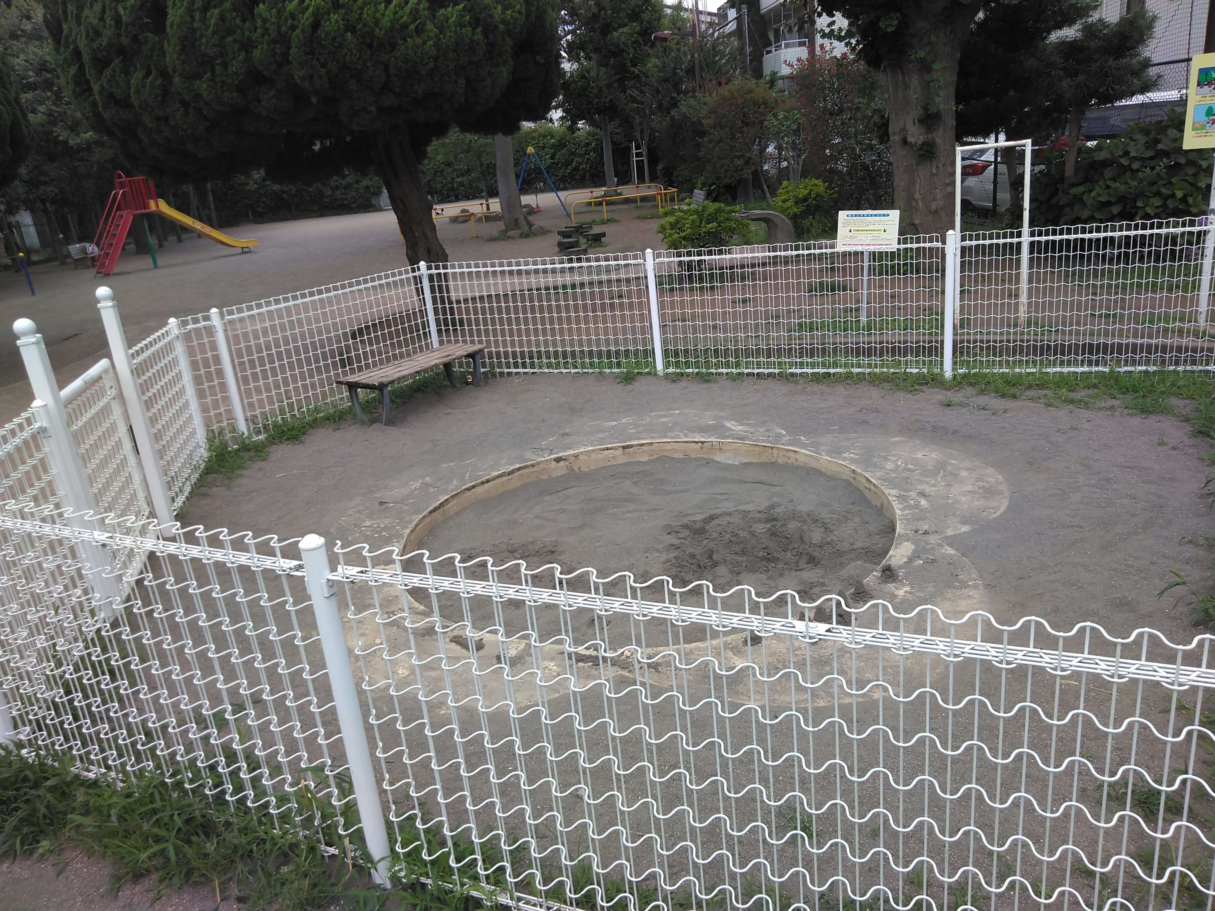 円形の深い砂場は柵付きで、ボール遊びをしている広場から最も遠いです。
