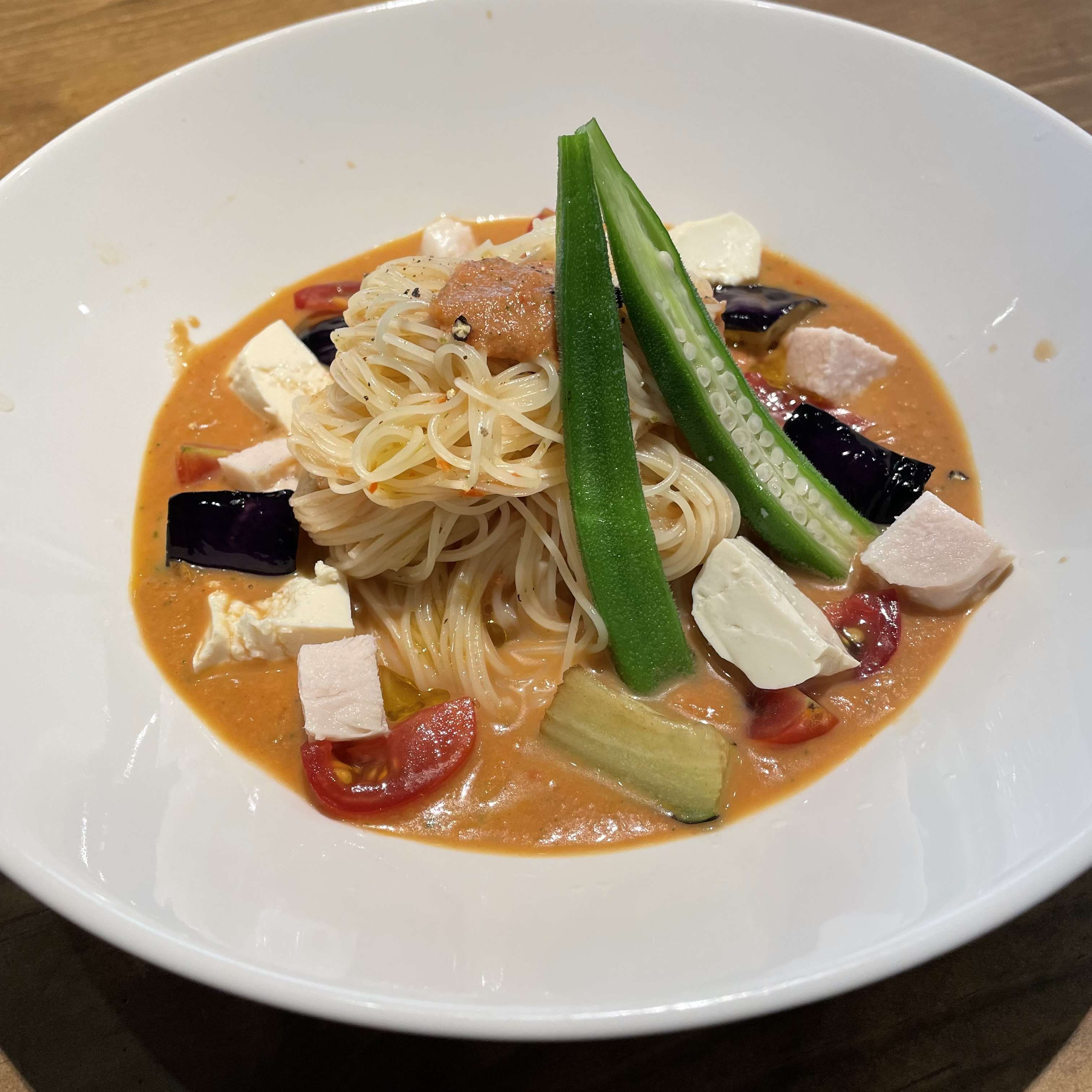 ガスパチョパスタは、暑い季節にピッタリの冷たいパスタです。