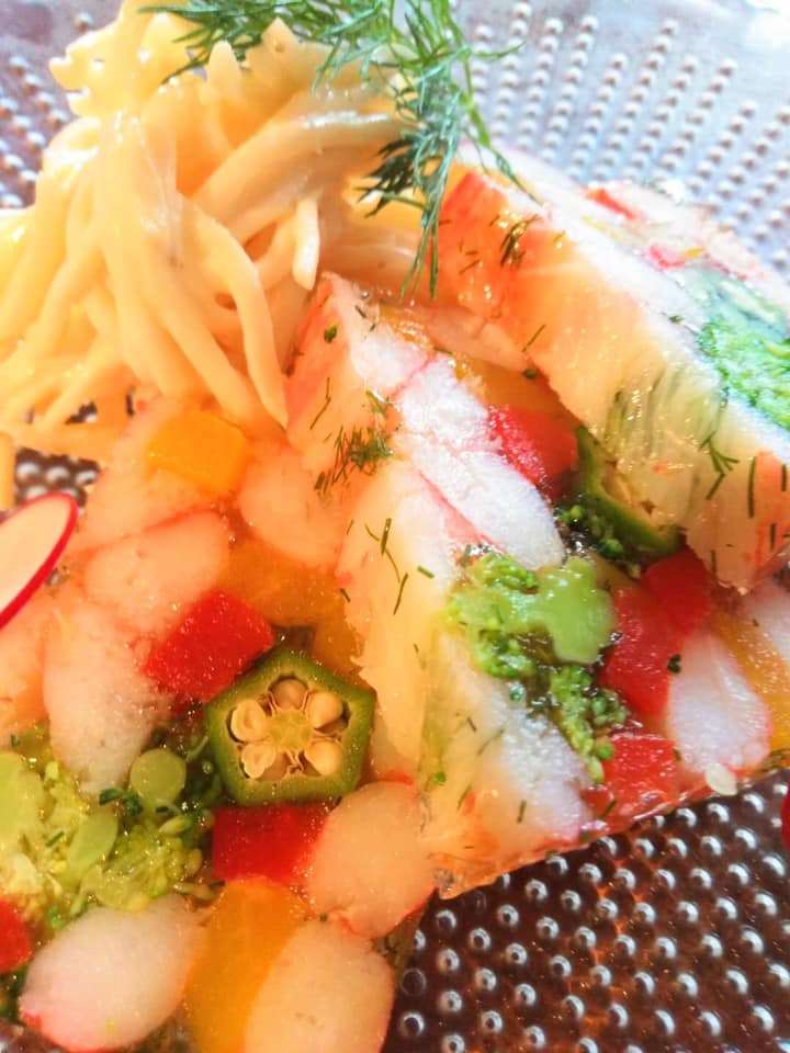 ズワイガニのテリーヌは見た目も爽やかな、夏らしい一皿。