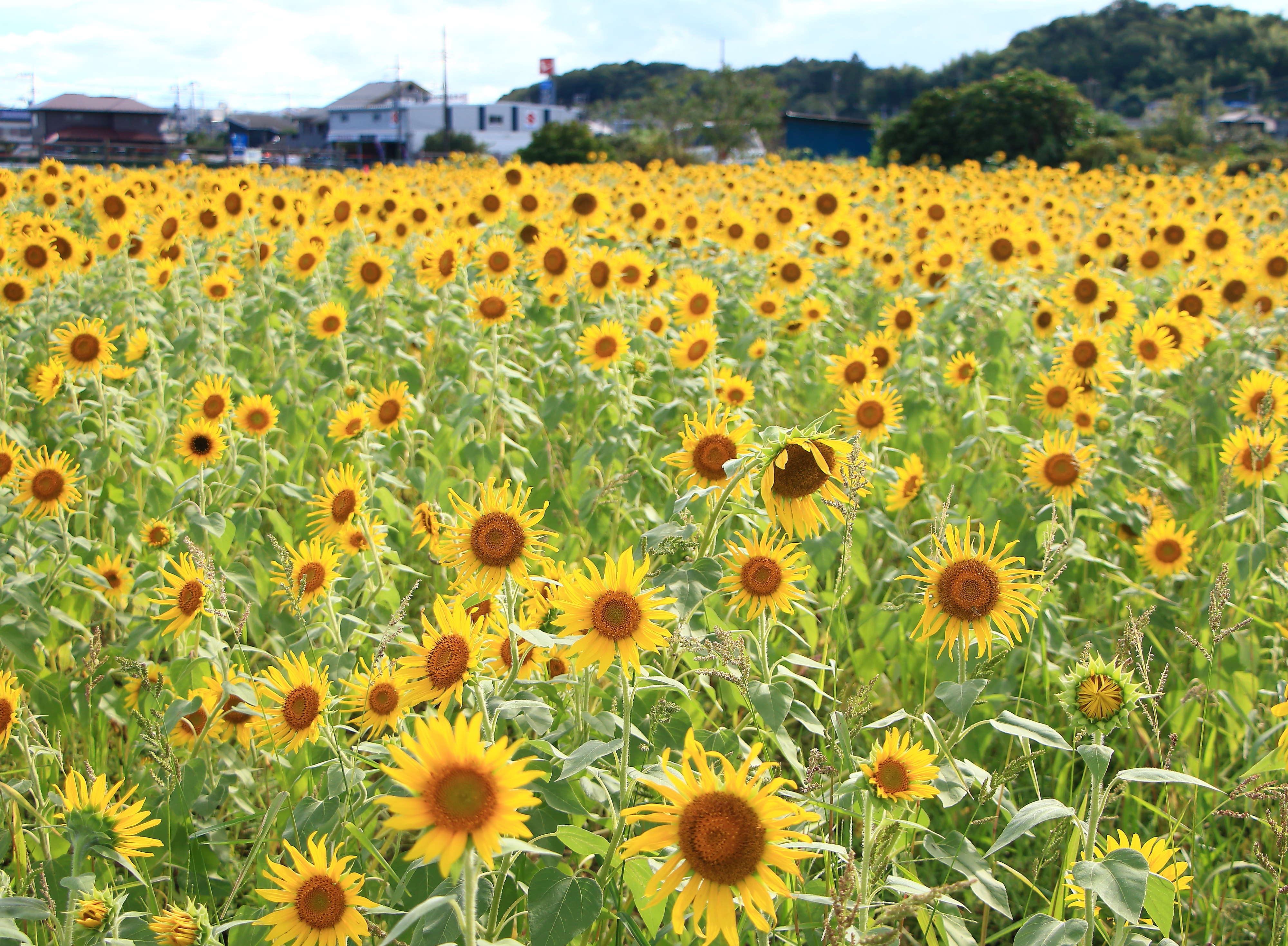 柿生駅からバスに乗って行ける早野ひまわり畑では、毎年8月中旬に多くのひまわりが咲き誇ります。