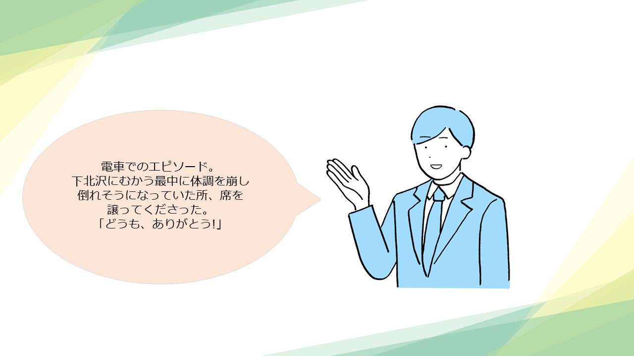 さっきまで冷ややかだった車内はいつのまにか温かい空気が漂い、感謝と共に降車した。