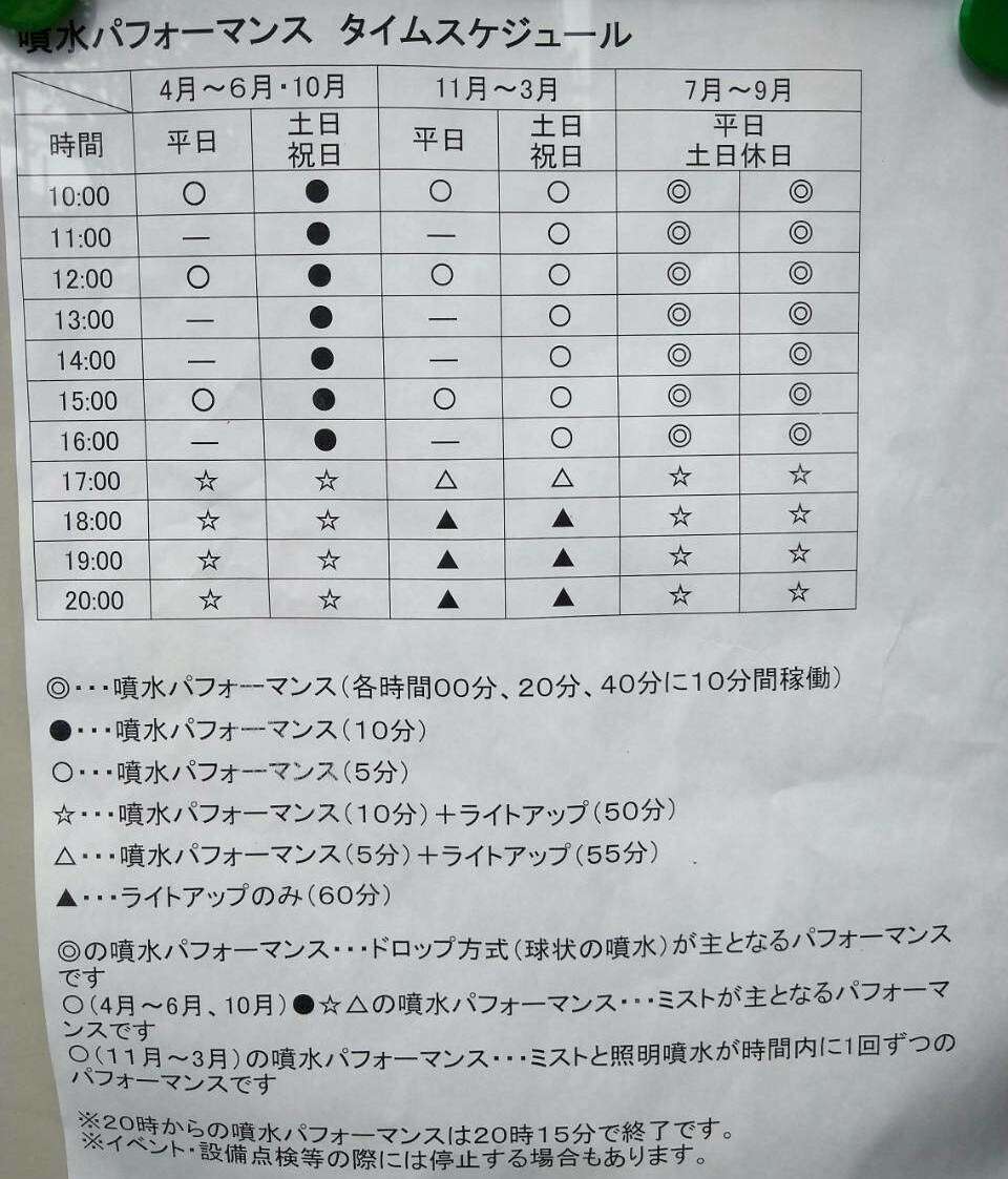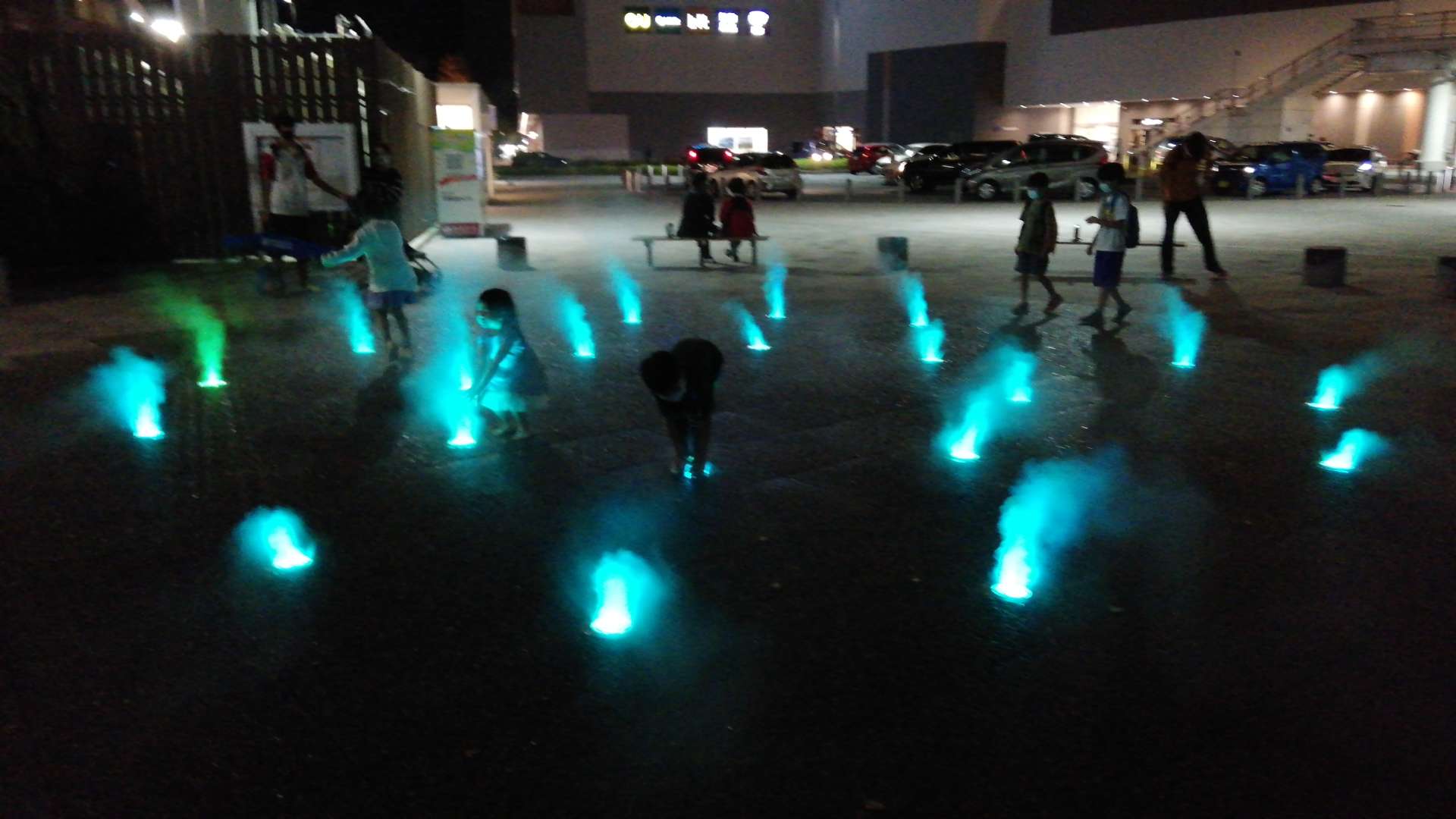 昼間は公園遊び優先で見られなかったのですが、帰りにライトアップミストを観賞することができました。
