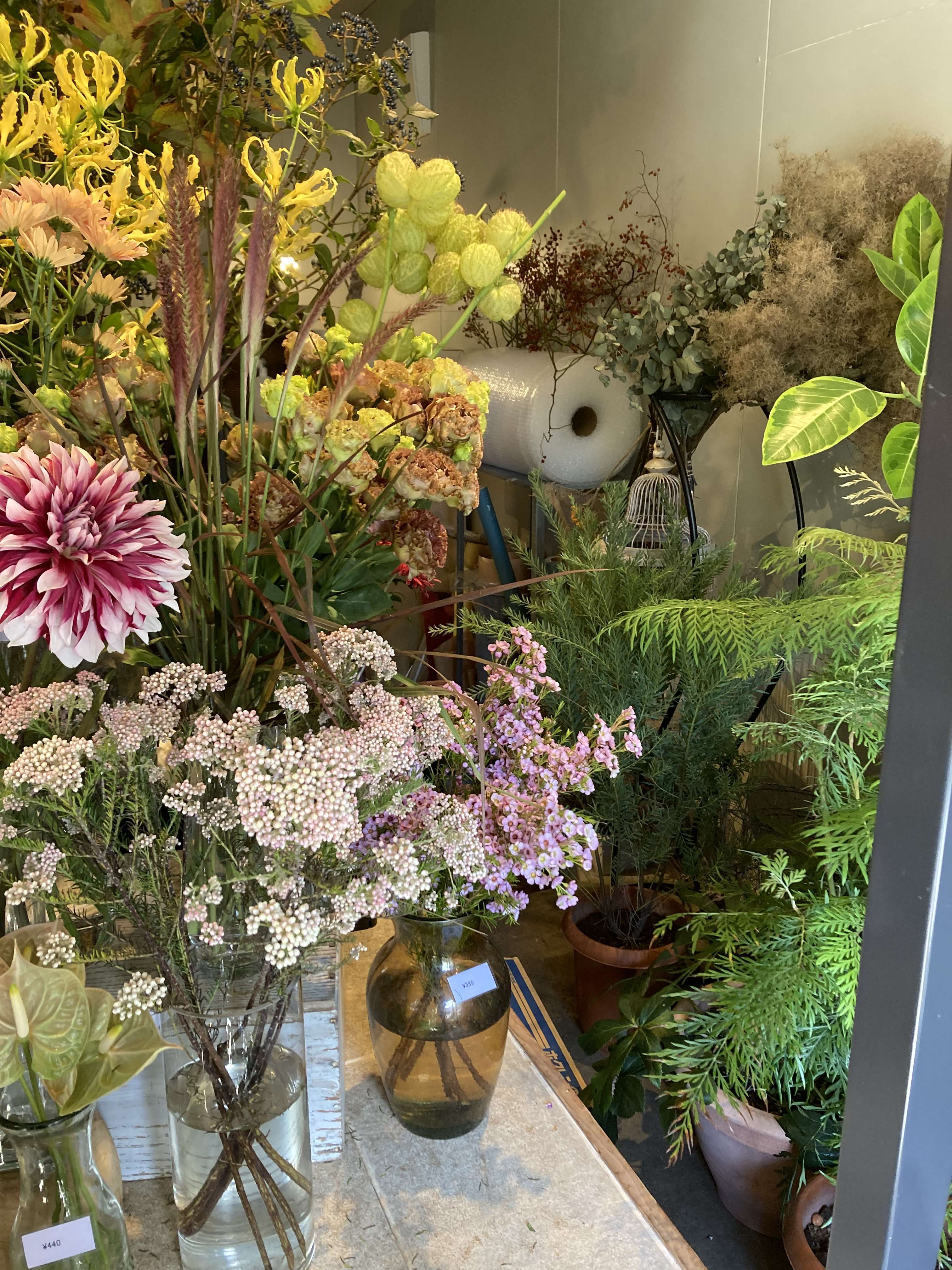 お店の外にはセンスよく鉢物がディスプレイされていて、ガラスのドアを覗くと中にはところ狭しと定版のお花や、珍しいお花、枝物がある心地よい空間です。