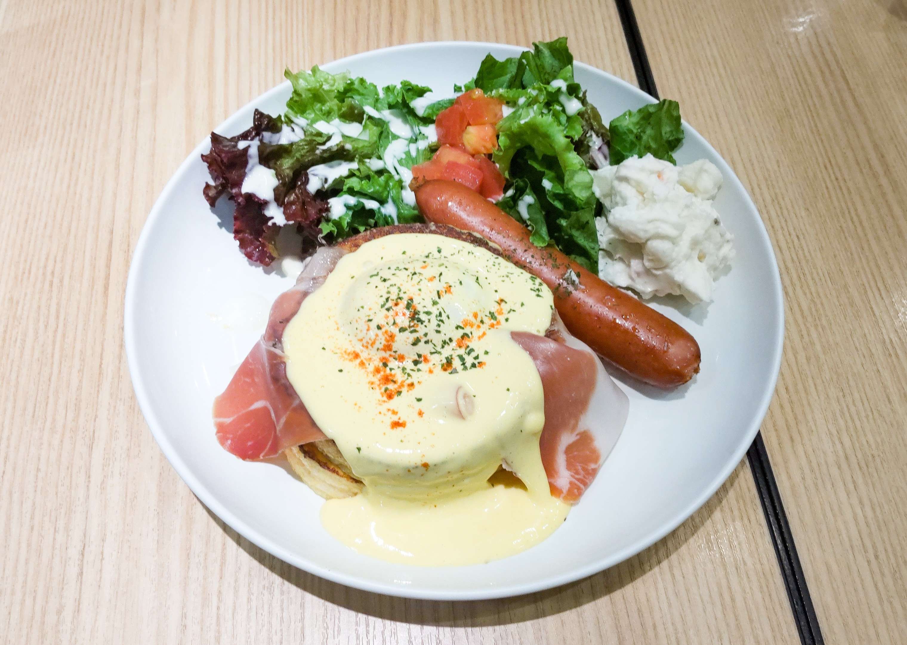 トロトロの半熟卵が掛けられたフレンチトーストに生ハムとサラダ、ウインナーとポテトサラダがついています!