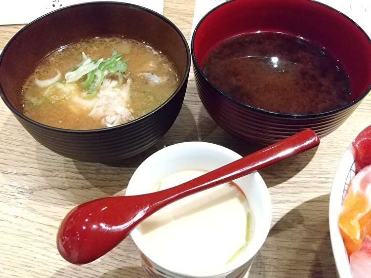 店員さんが味噌汁は2種類から選べることを案内してくれますが、「2種類ともお持ちすることもできますよ。」との嬉しいお言葉に甘えて、2種類ともいただきました。