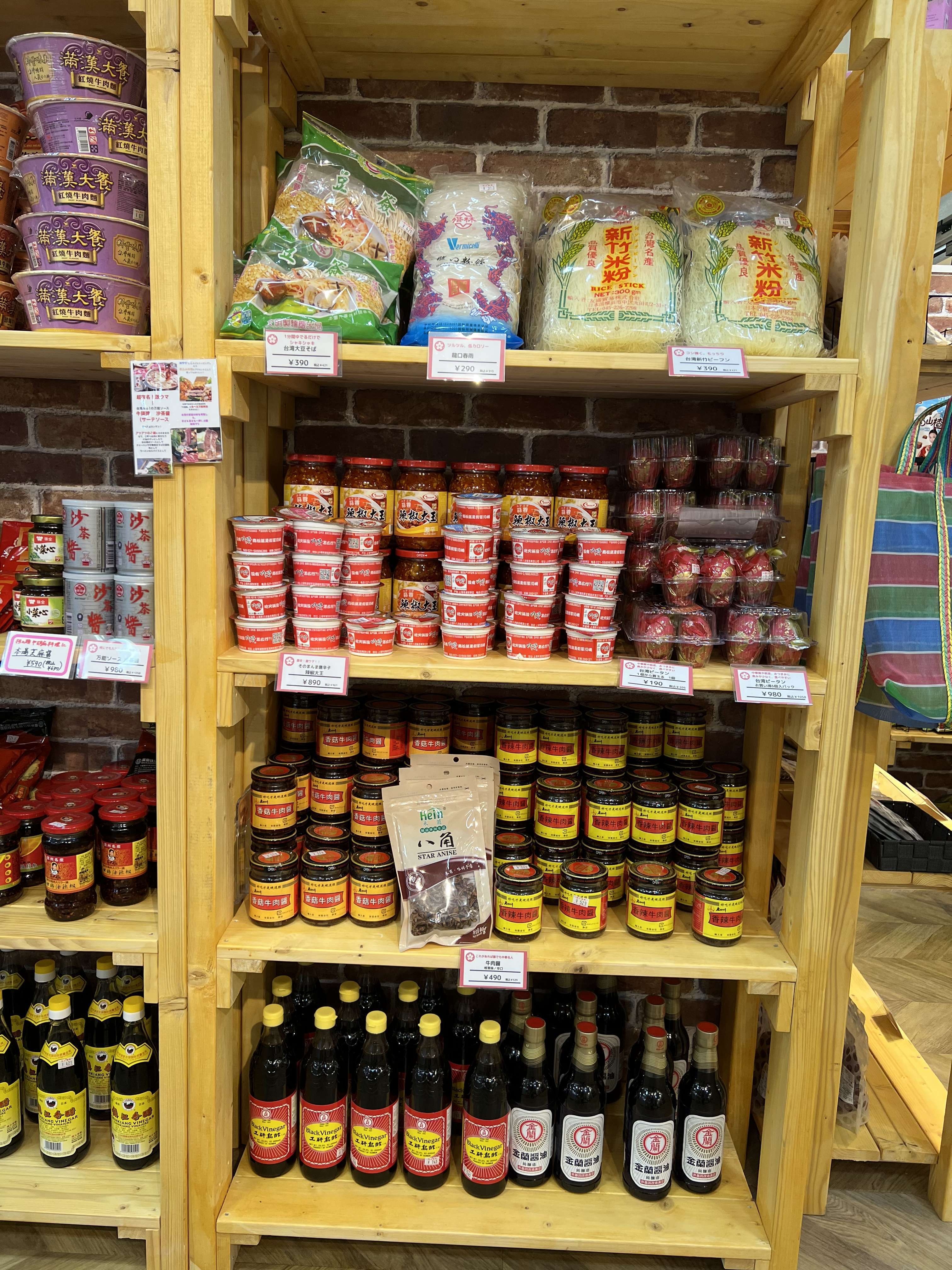 台湾製の醤油、芝麻醤、ラー油、牛肉醬などの調味料も豊富。