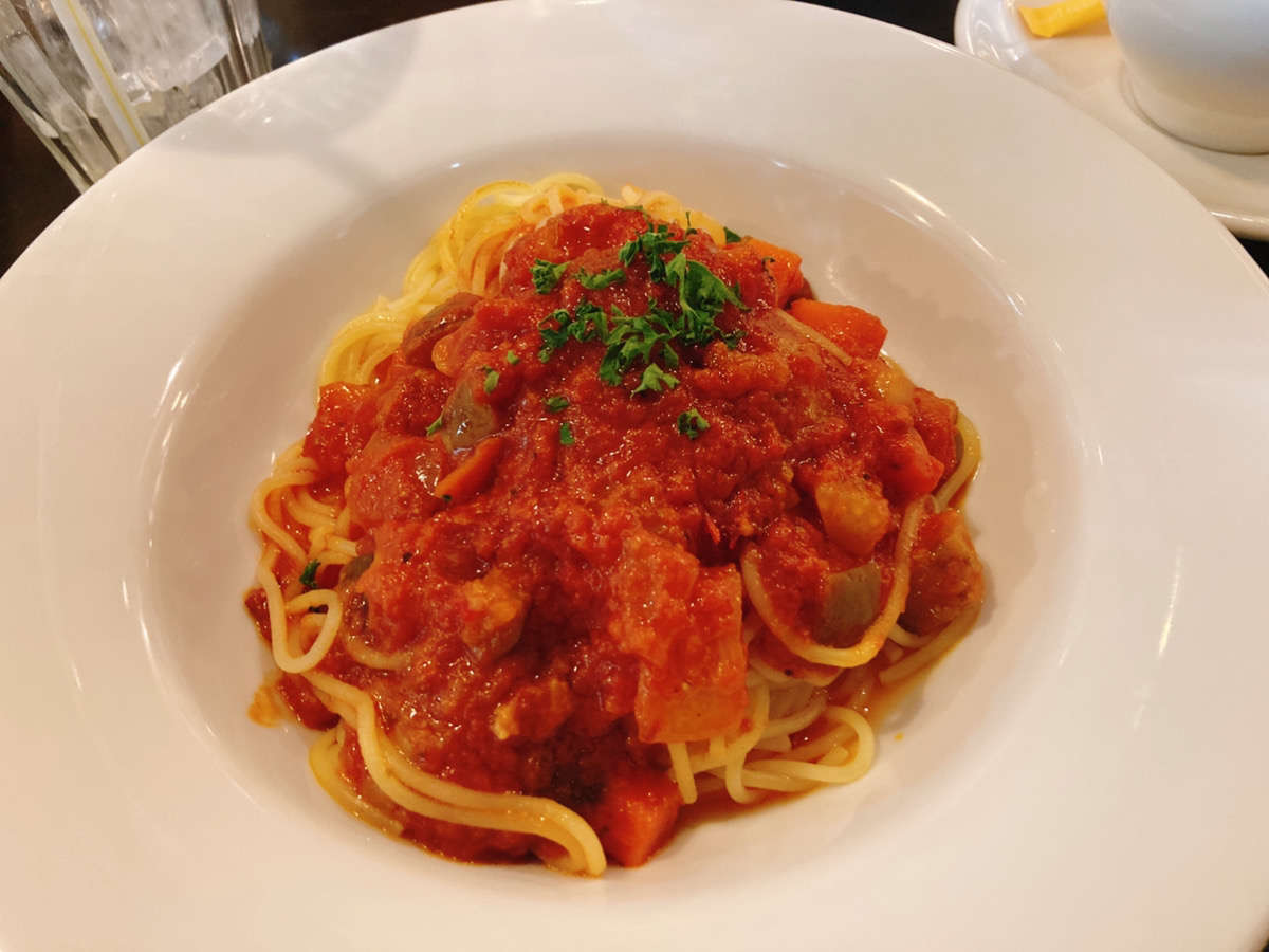 野菜たっぷりのトマトソースパスタは、ビックリするほど具沢山でトマトソースは絶妙!