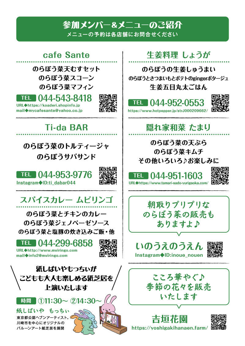 5つのお店のお料理や、のらぼう菜販売、紙芝居、吉垣花園よりお花の販売もあります!