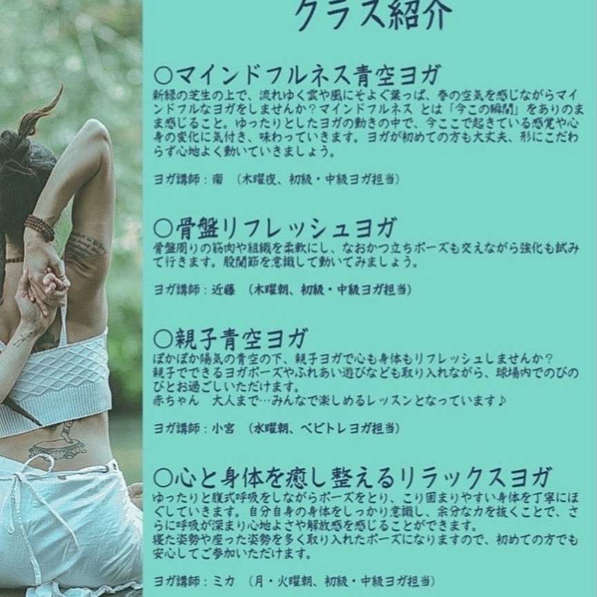 五感で動くマインドフルネスヨガ、骨盤、親子ヨガ、リラックスヨガなど、いろいろなヨガが楽しめます。