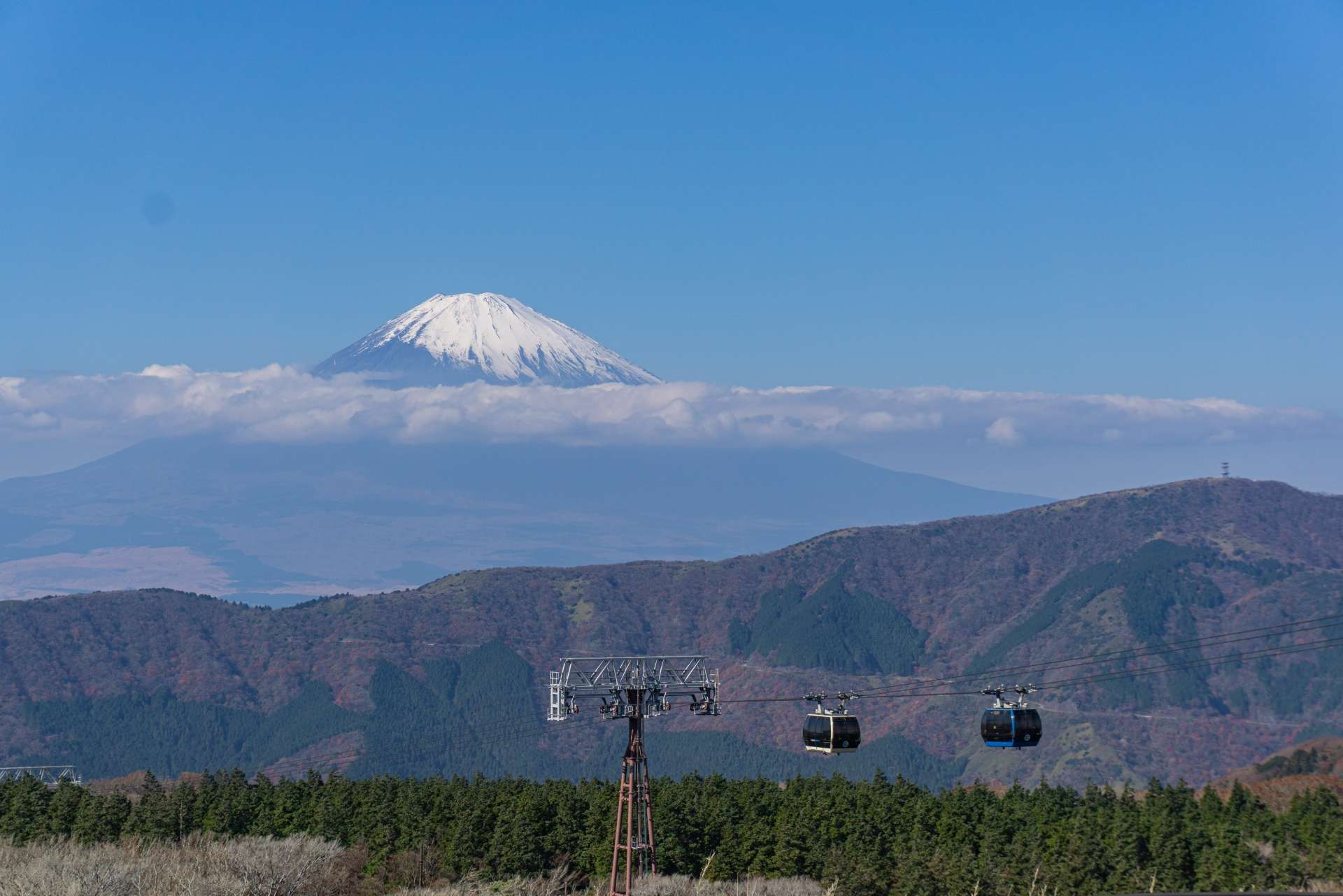 車窓からは広大な大涌谷に加えて箱根の山々も見渡せて、天気が良ければ富士山やスカイツリーまでも望めます。