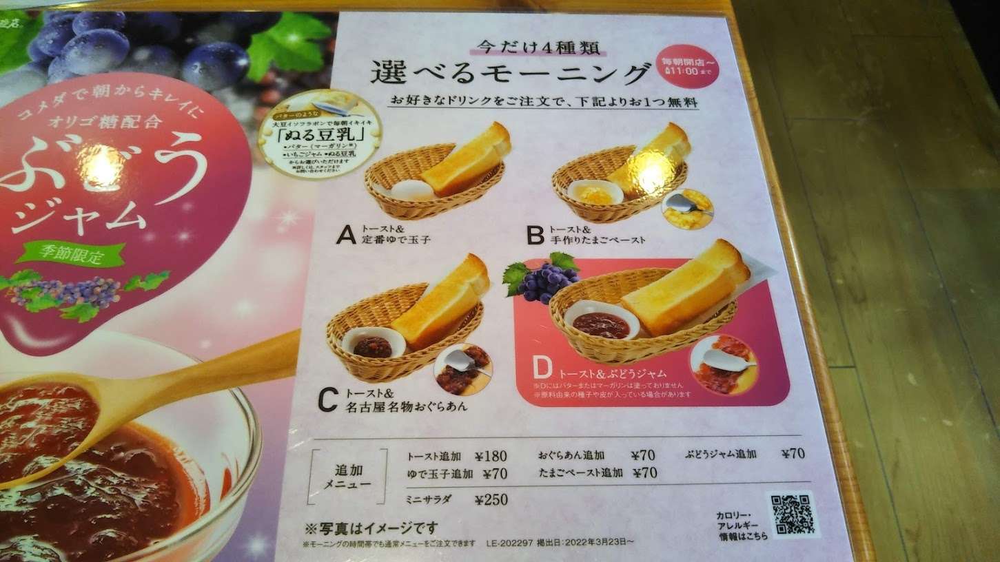 コメダ珈琲のモーニングといえば、ドリンクを注文するとついてくるモーニングサービス。