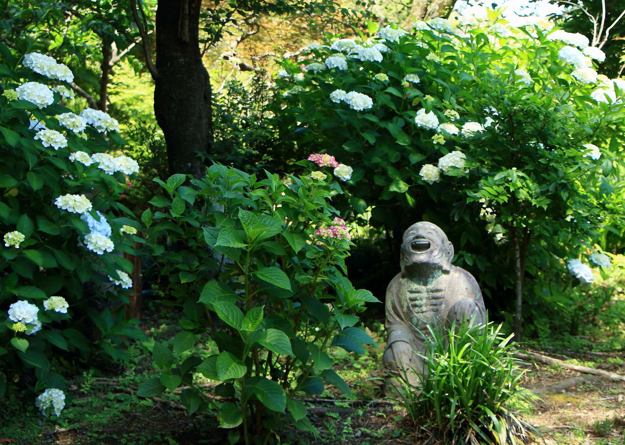 あじさいと羅漢像のコラボレーションが見られる柿生にある浄慶寺。