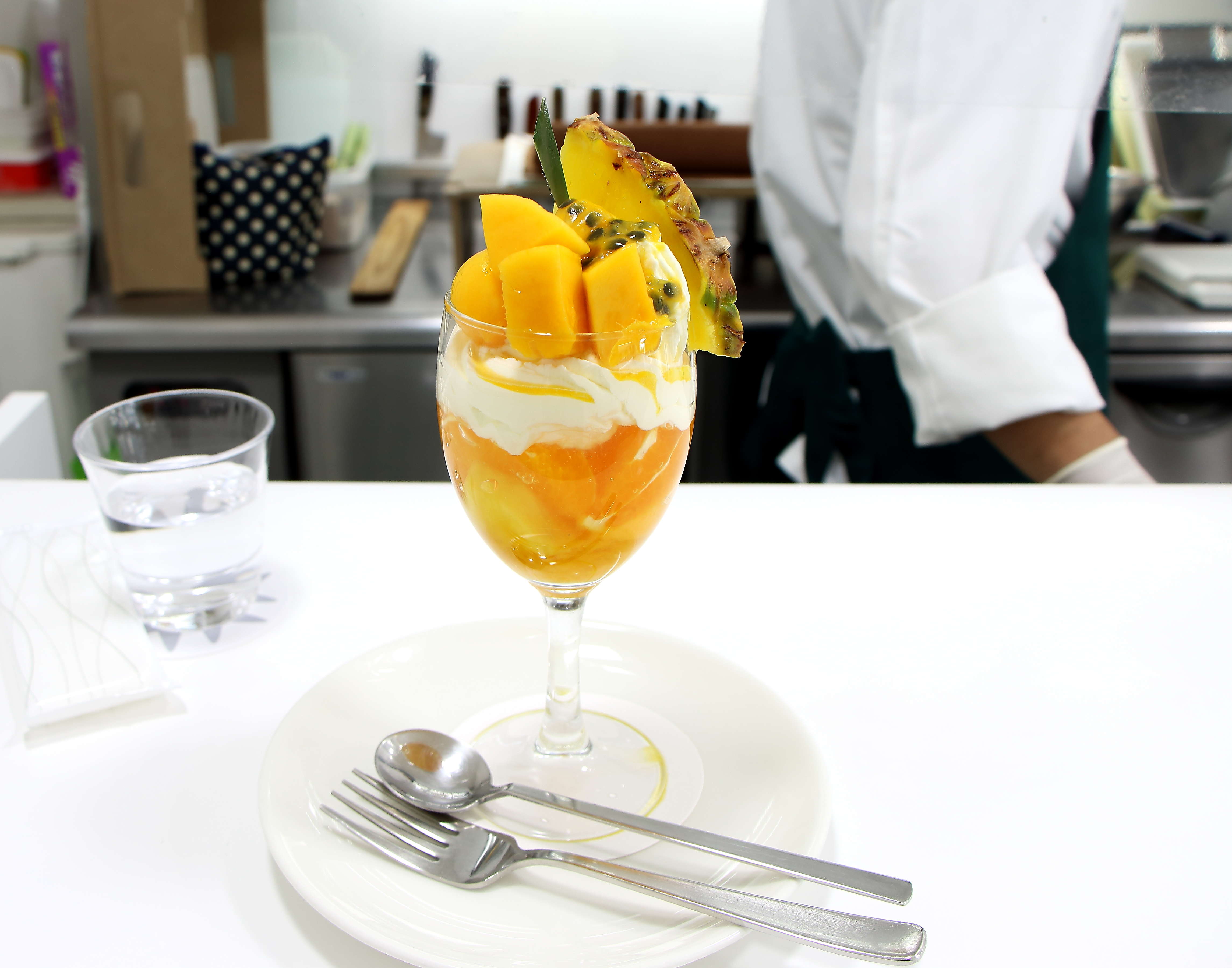この時期美味しい南国のフルーツ、マンゴ、パパイア、パッションフルーツ、バニラアイス、北海道産フレッシュクリーム、下層にはオレンジ、レモンジュレも爽やかに、ライチシャーベット。