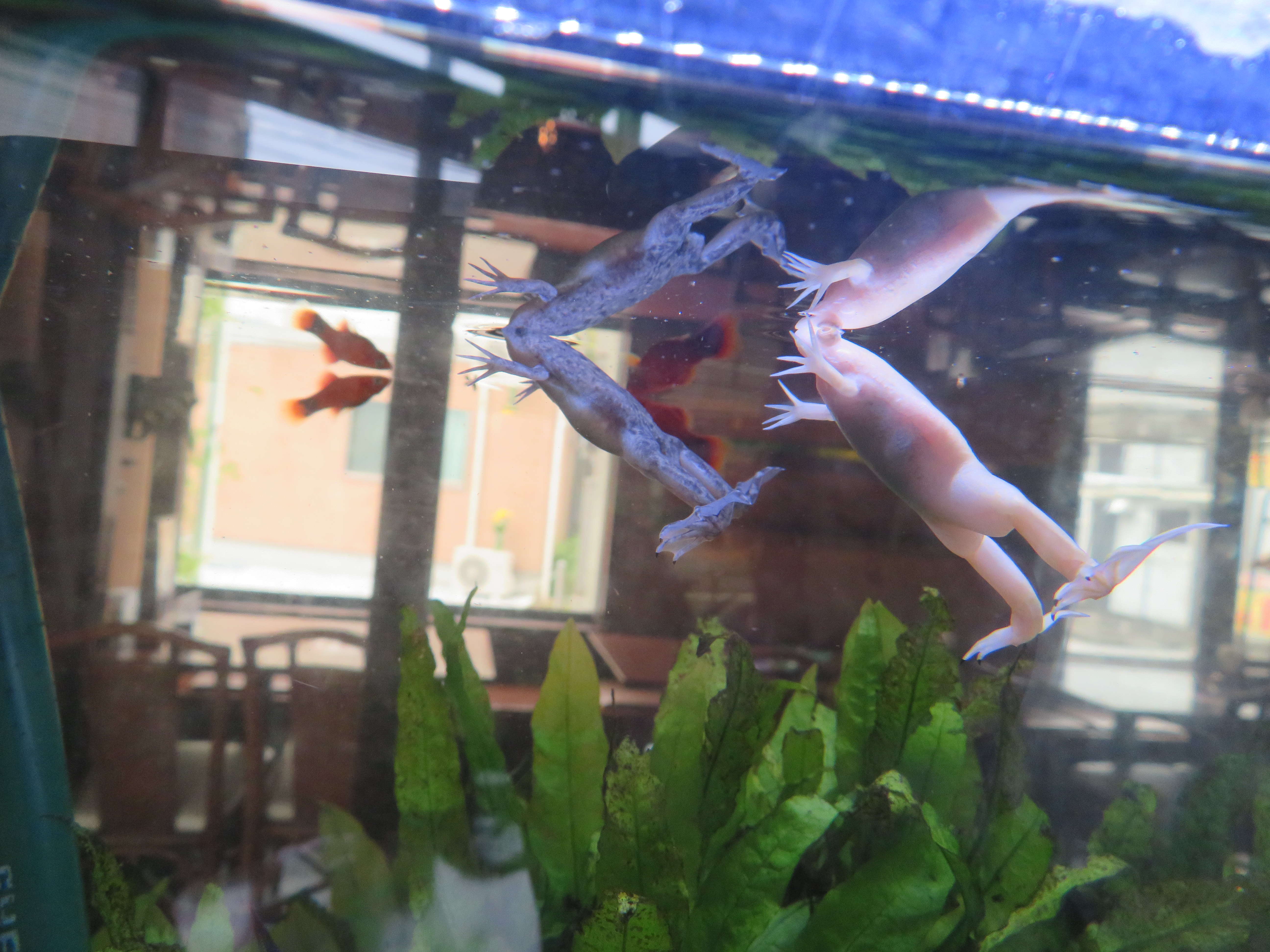 水槽には多種の魚が泳いでいますが、目を引くのが数匹のカエル。