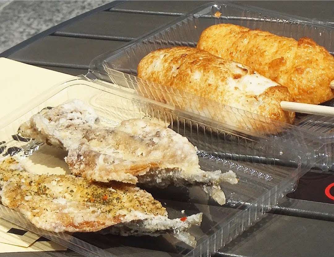 3階で購入できる、吟味したすり身を使用した揚げかまぼこ専門店「創作煉處 籠淸」の揚げかまぼこと、「小田原吉匠」の鯵の唐揚げ。