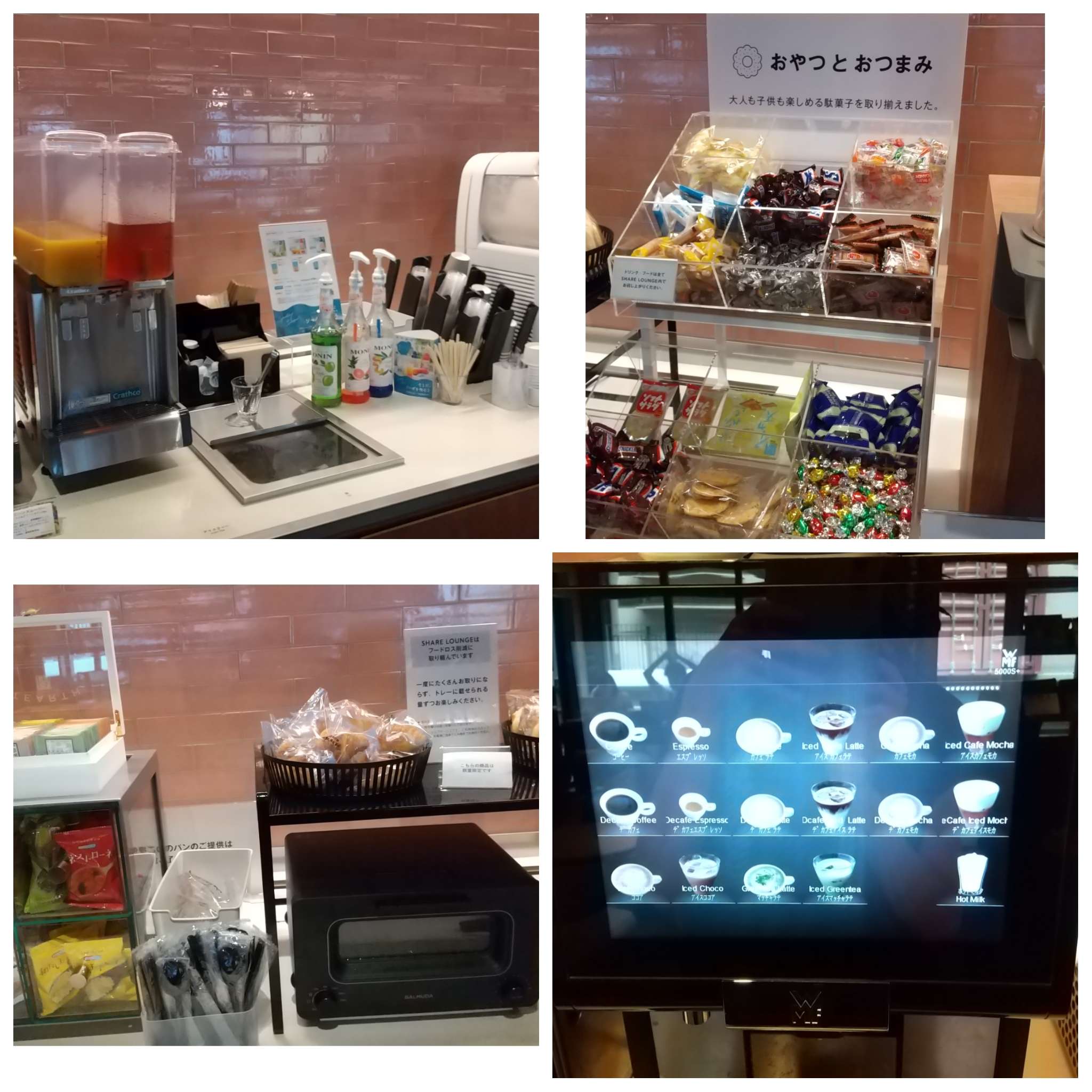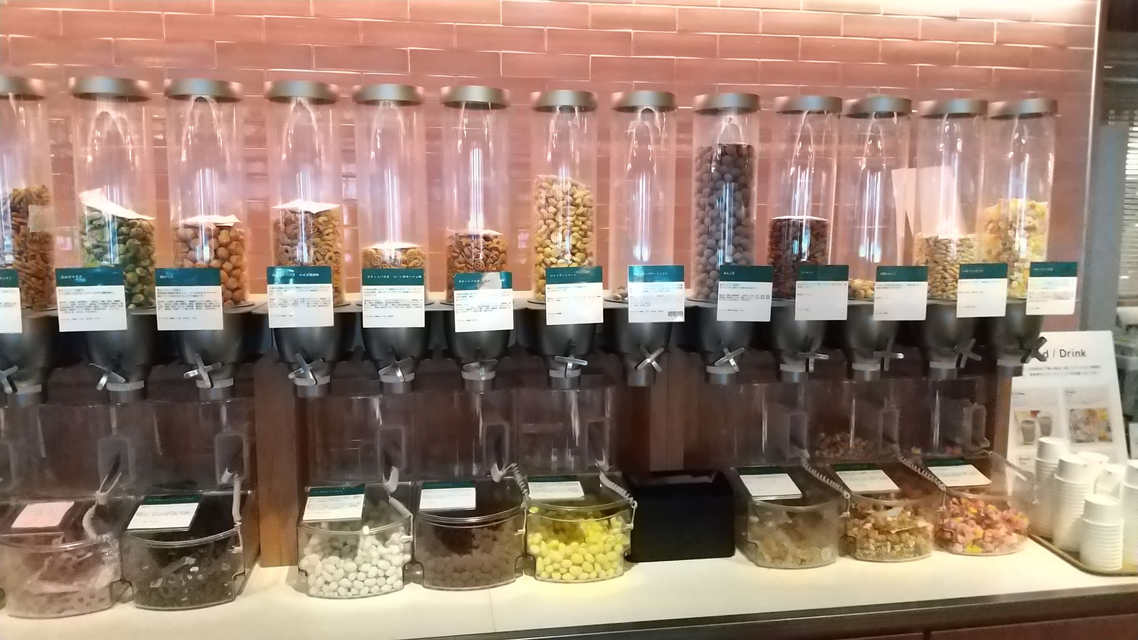 フリードリンク&スナックのコーナーからプレッツェルやナッツを好きなだけカップに入れて空いている席へ。