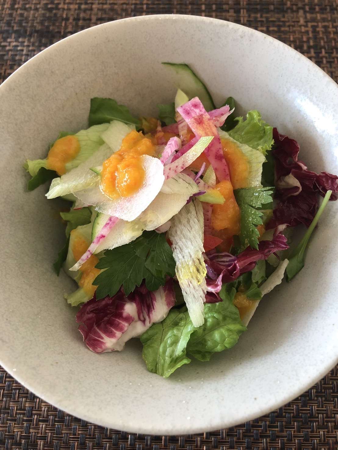 サラダは、深めの大きな器にたっぷり!自家製のドレッシングも底までたっぷり入っていて、最後まで美味しく頂けます。