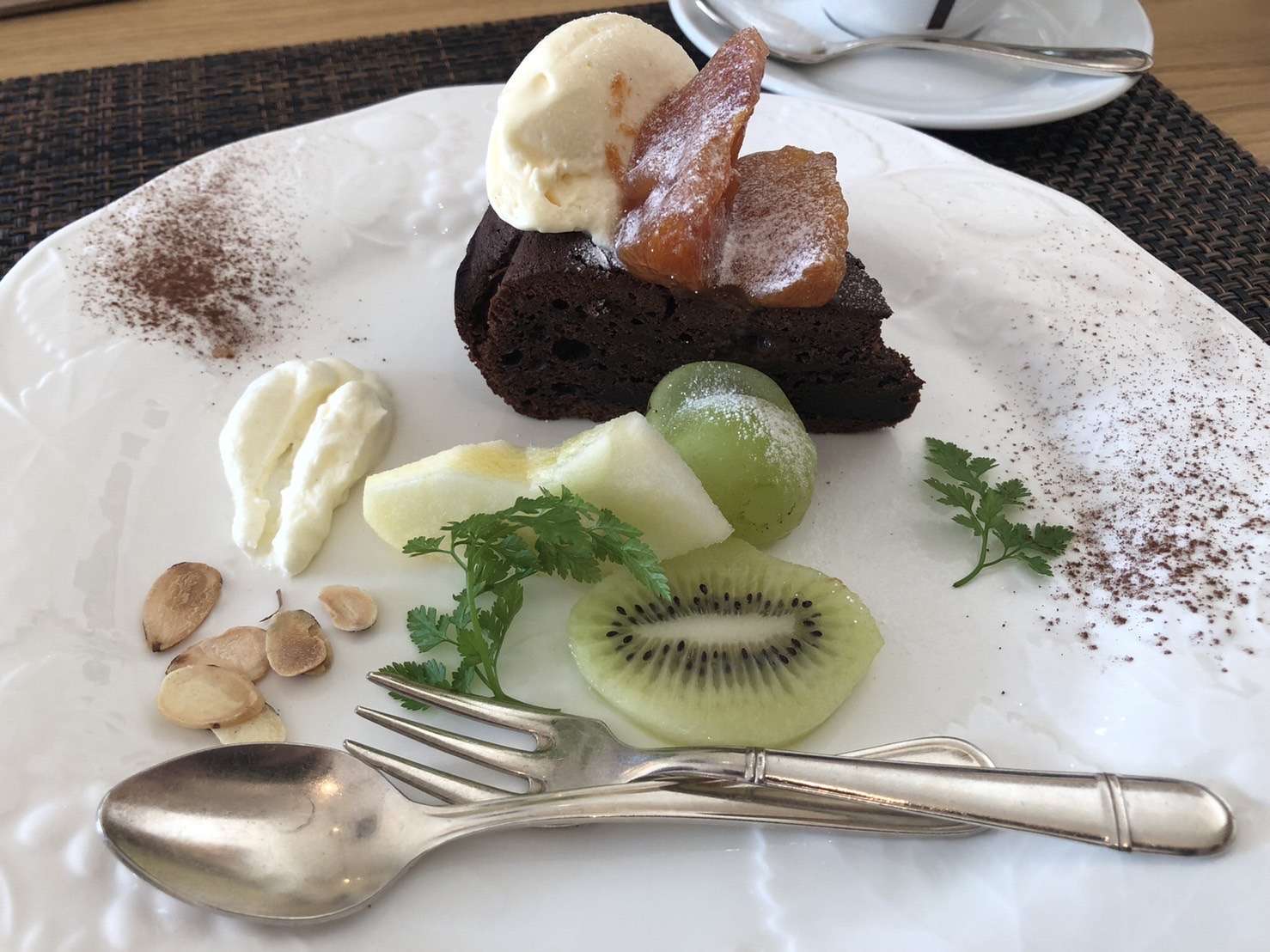 実家で採ったかきのコンポートを添えたビター風味のガトーショコラ